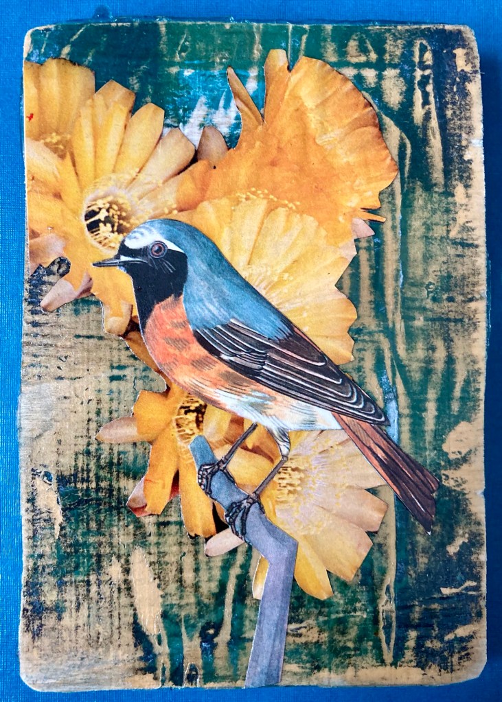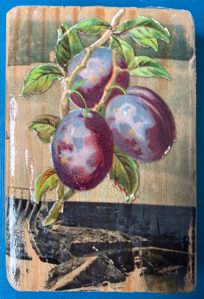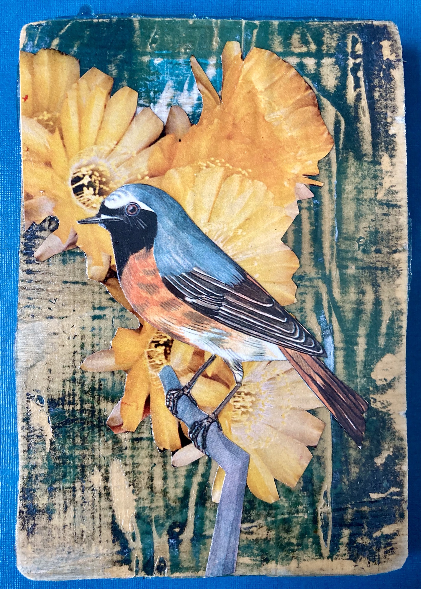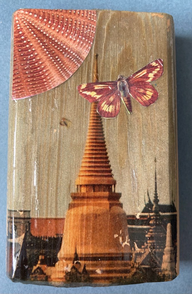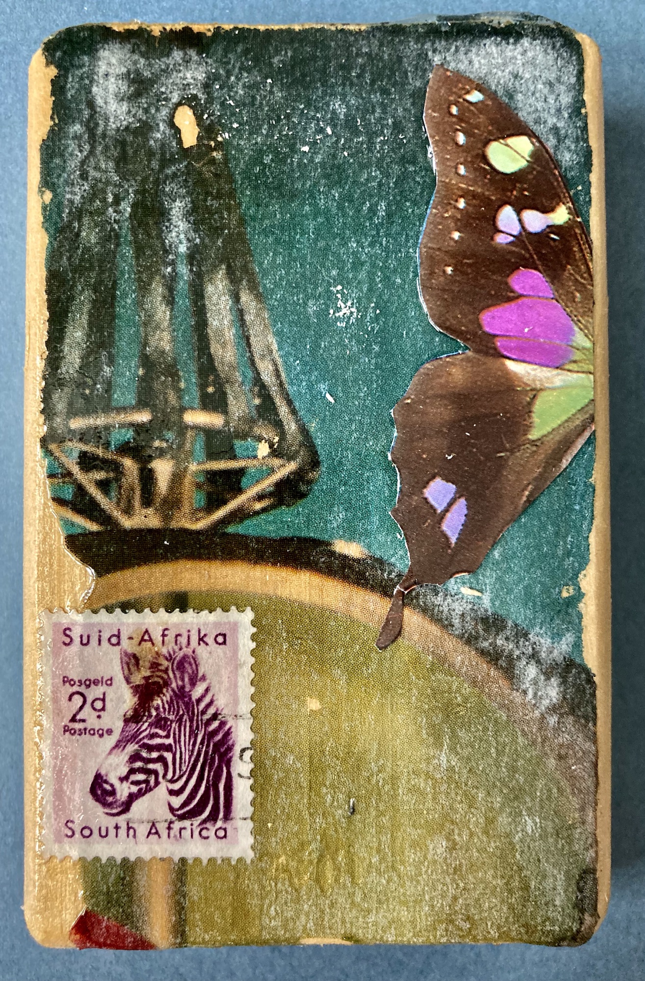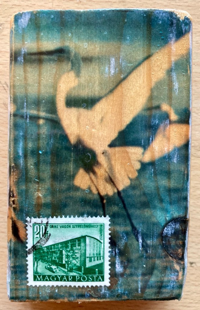 Small (6x9x1,5cm) pigmenttransfers/collages on wood.
