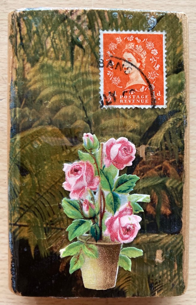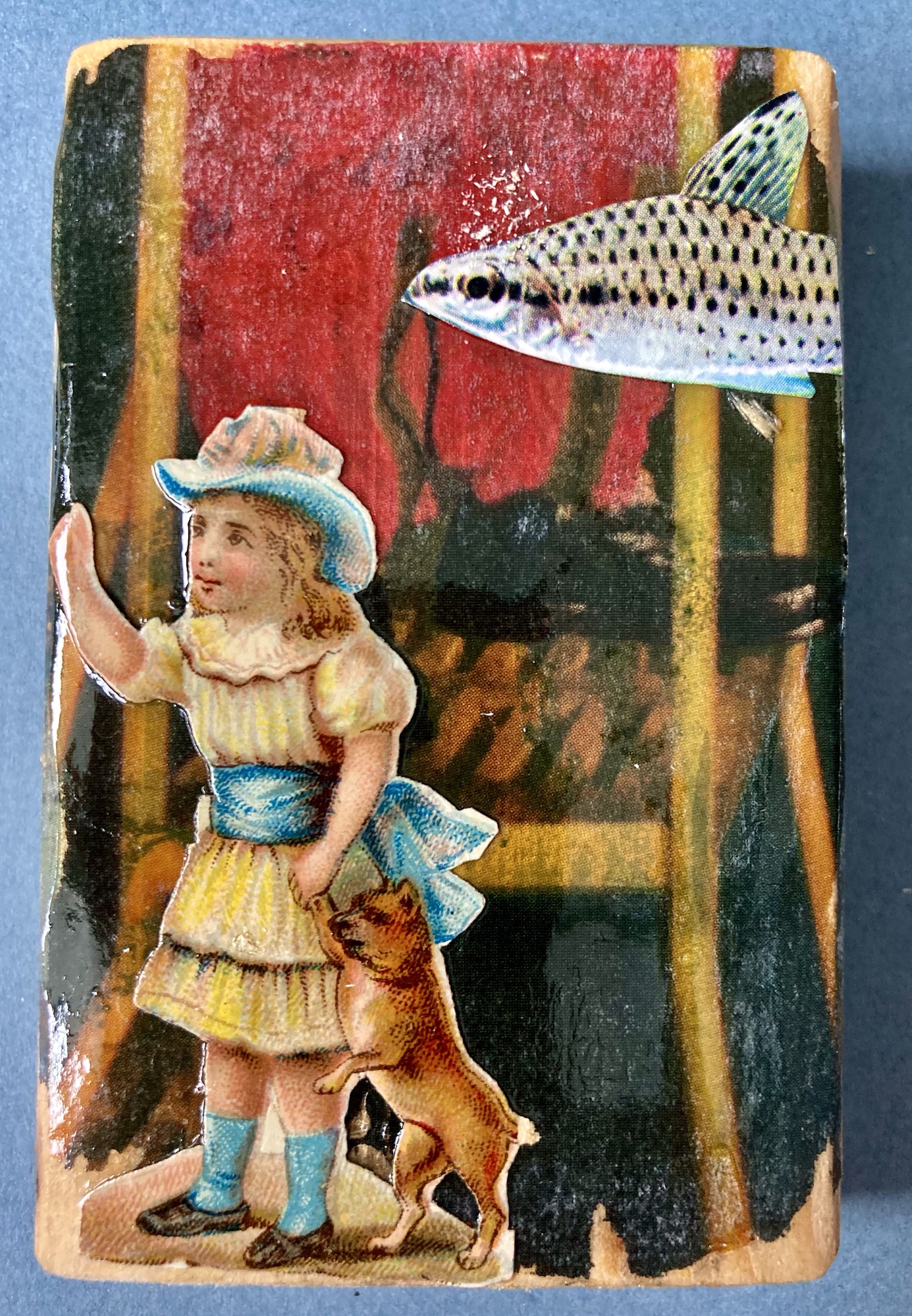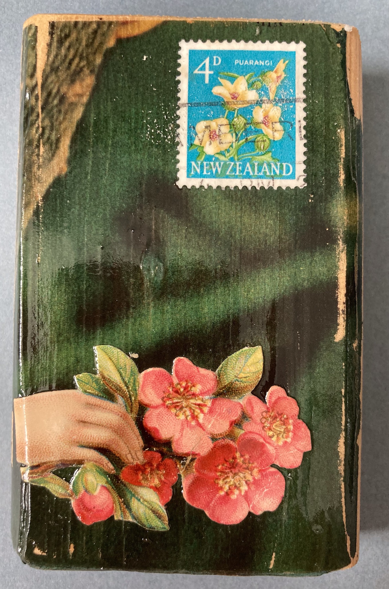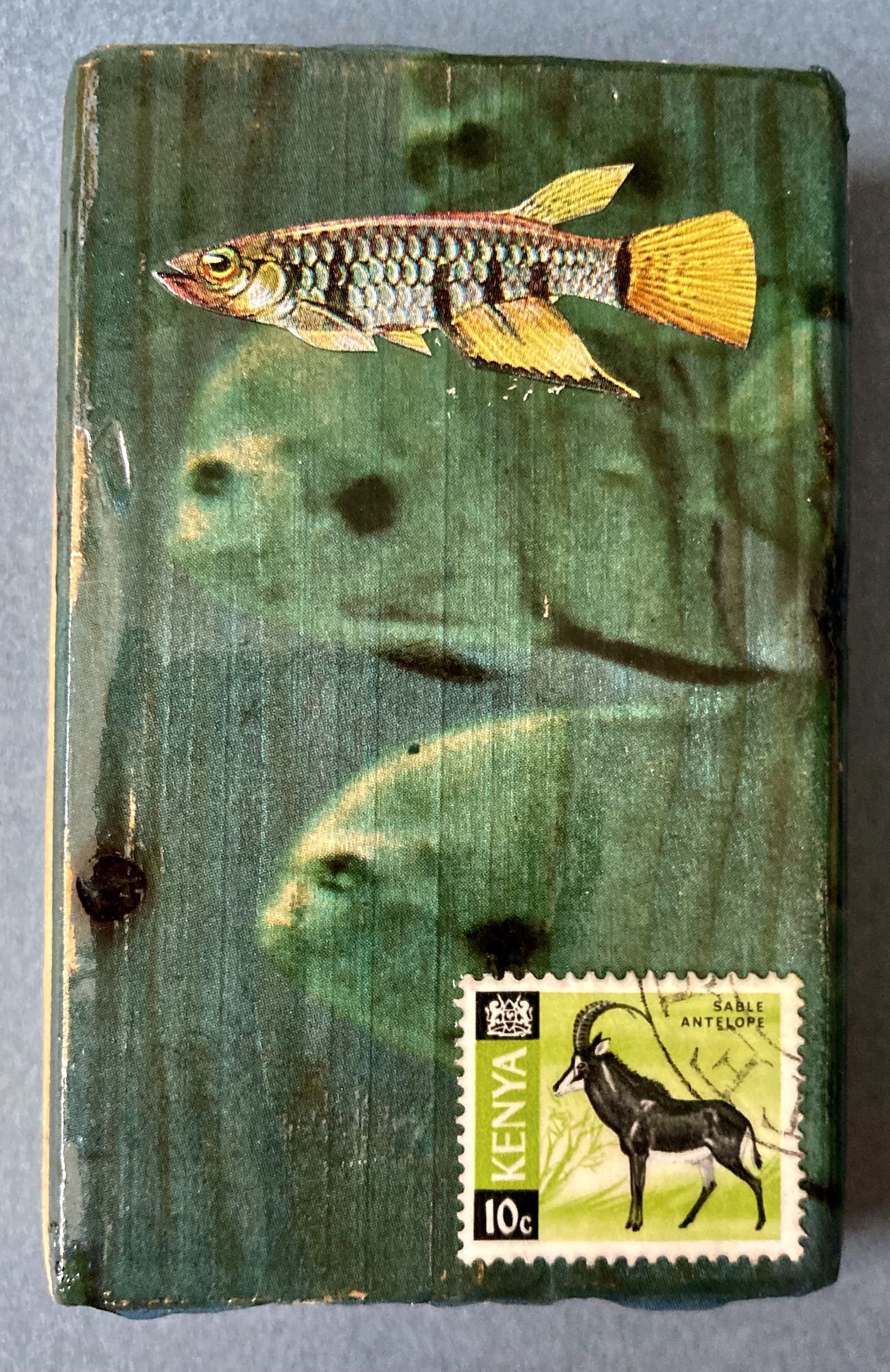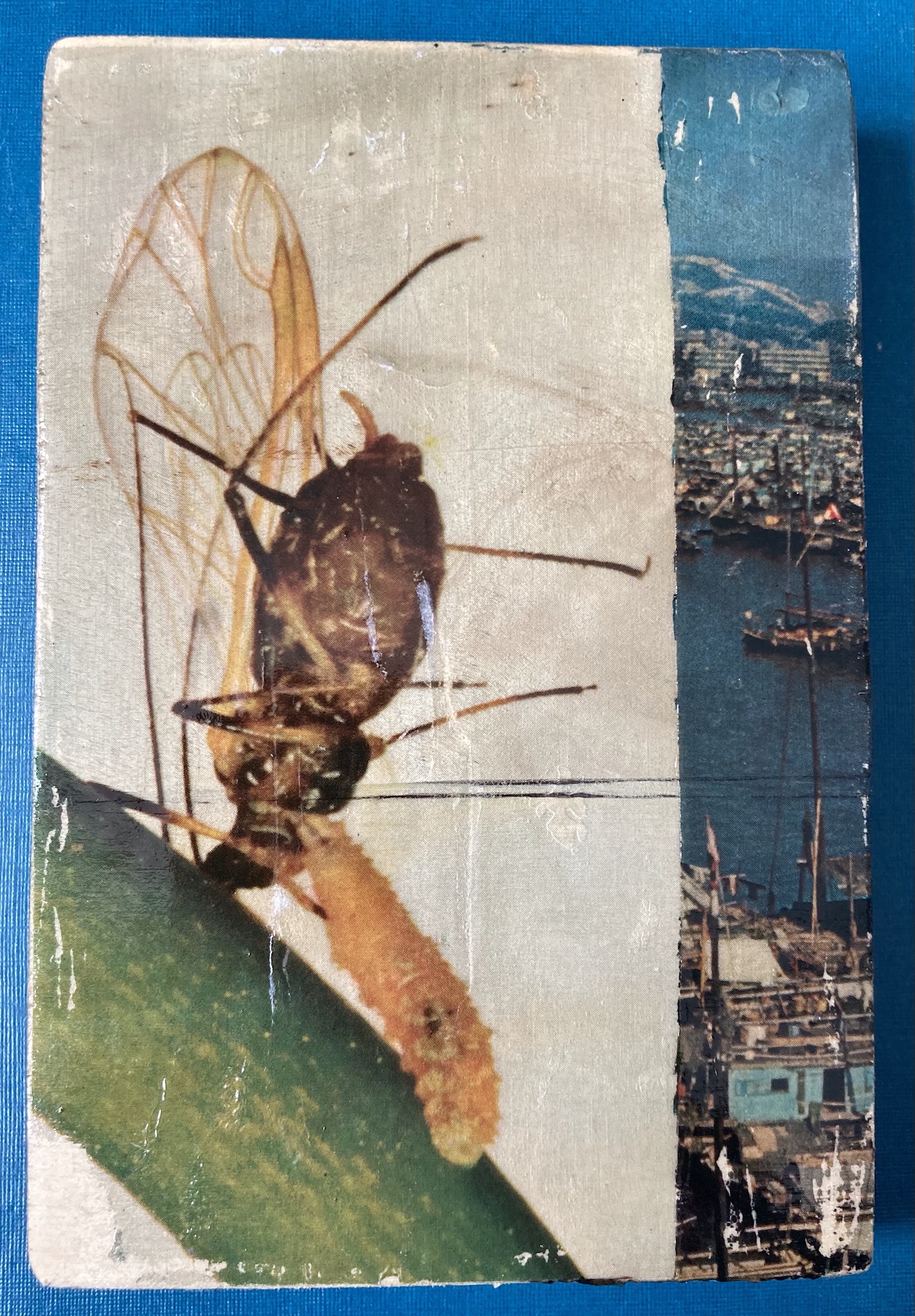 Small (6x9x1,5cm) pigmenttransfers/collages on wood.