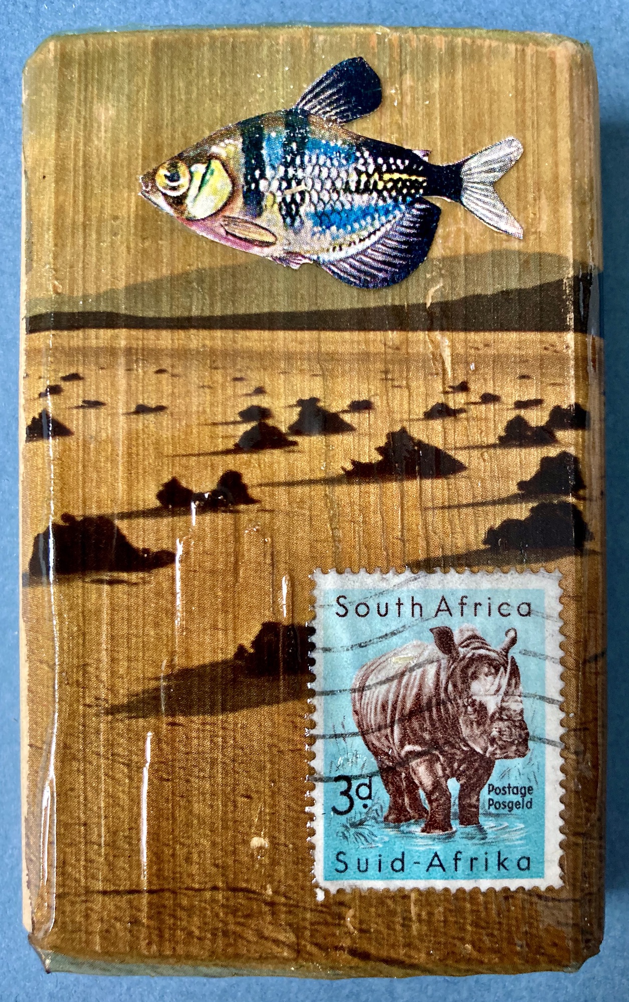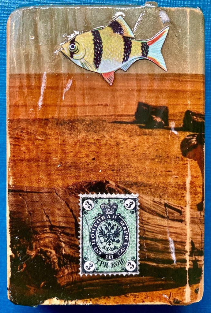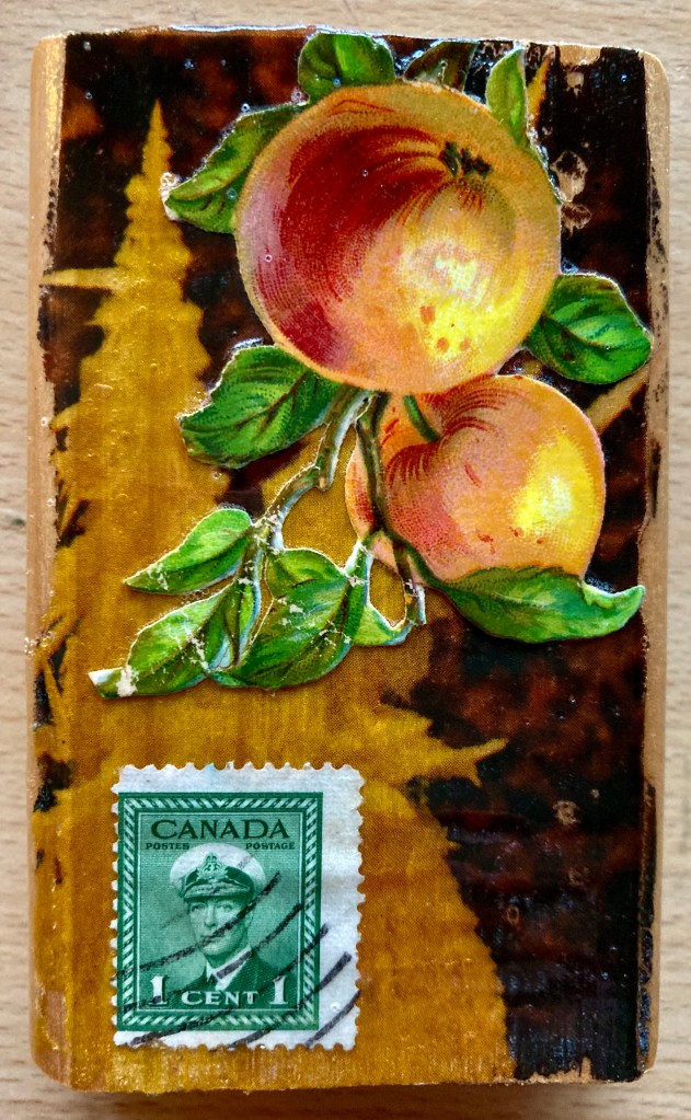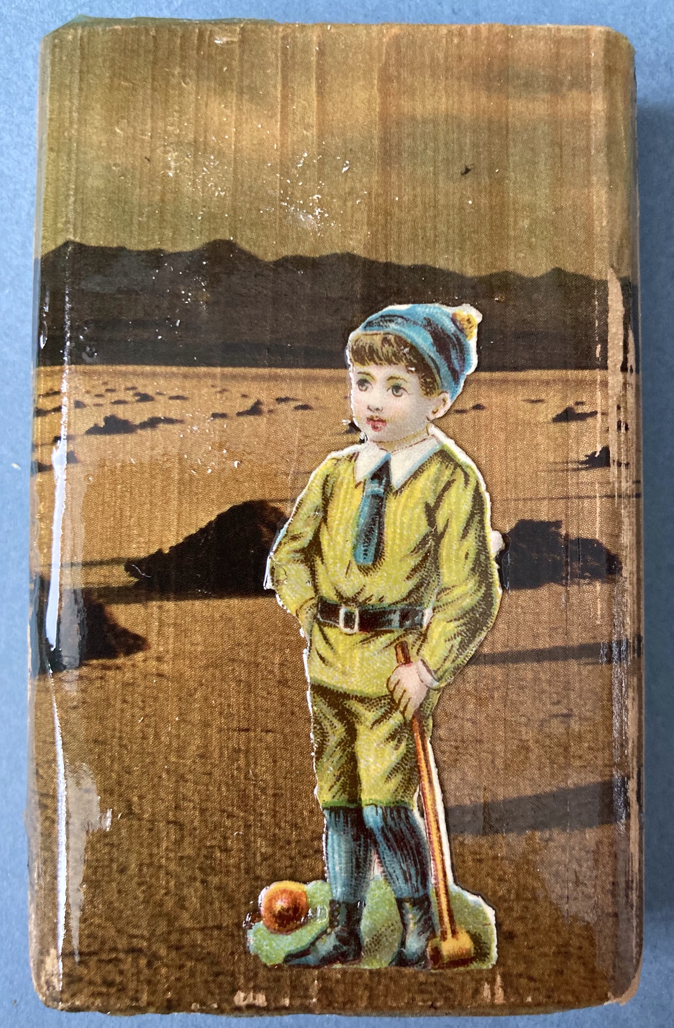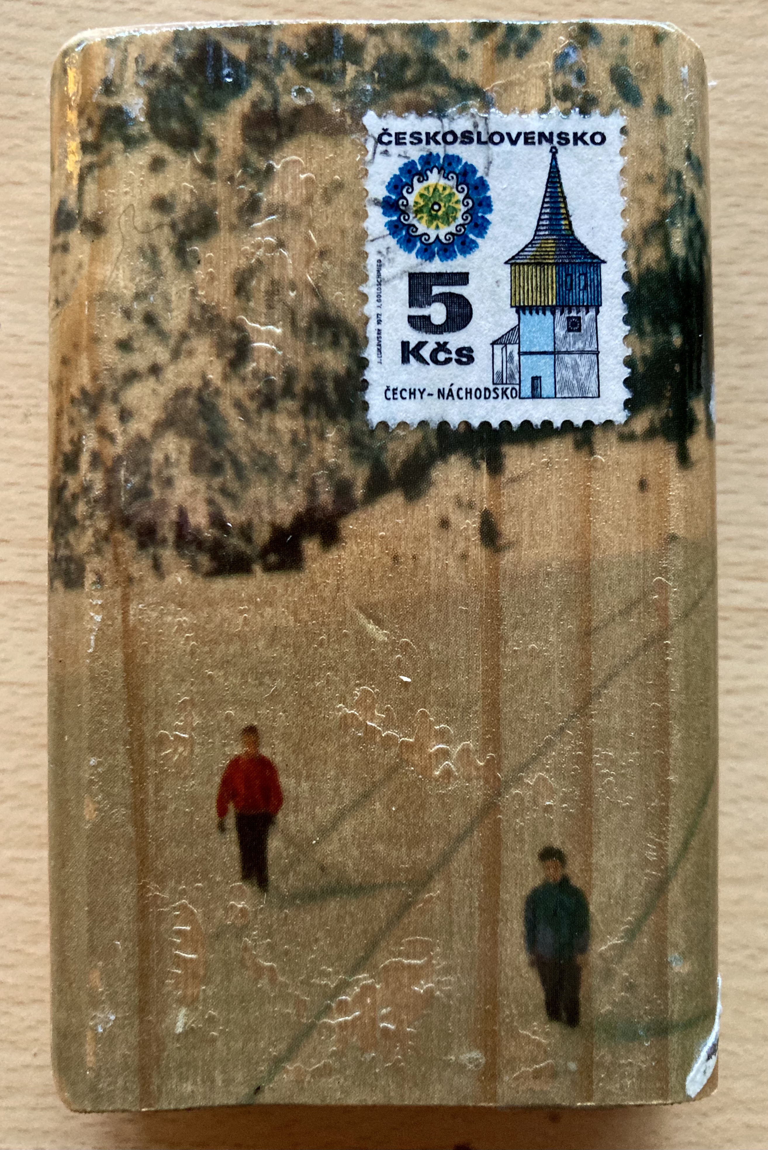 Small (6x9x1,5cm) pigmenttransfers/collages on wood.