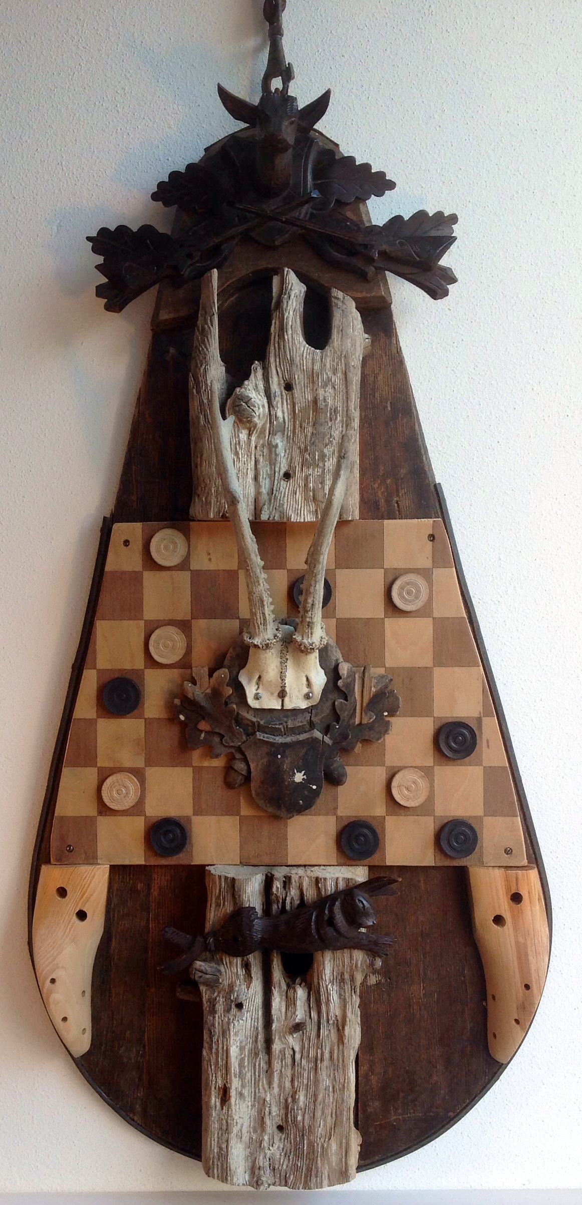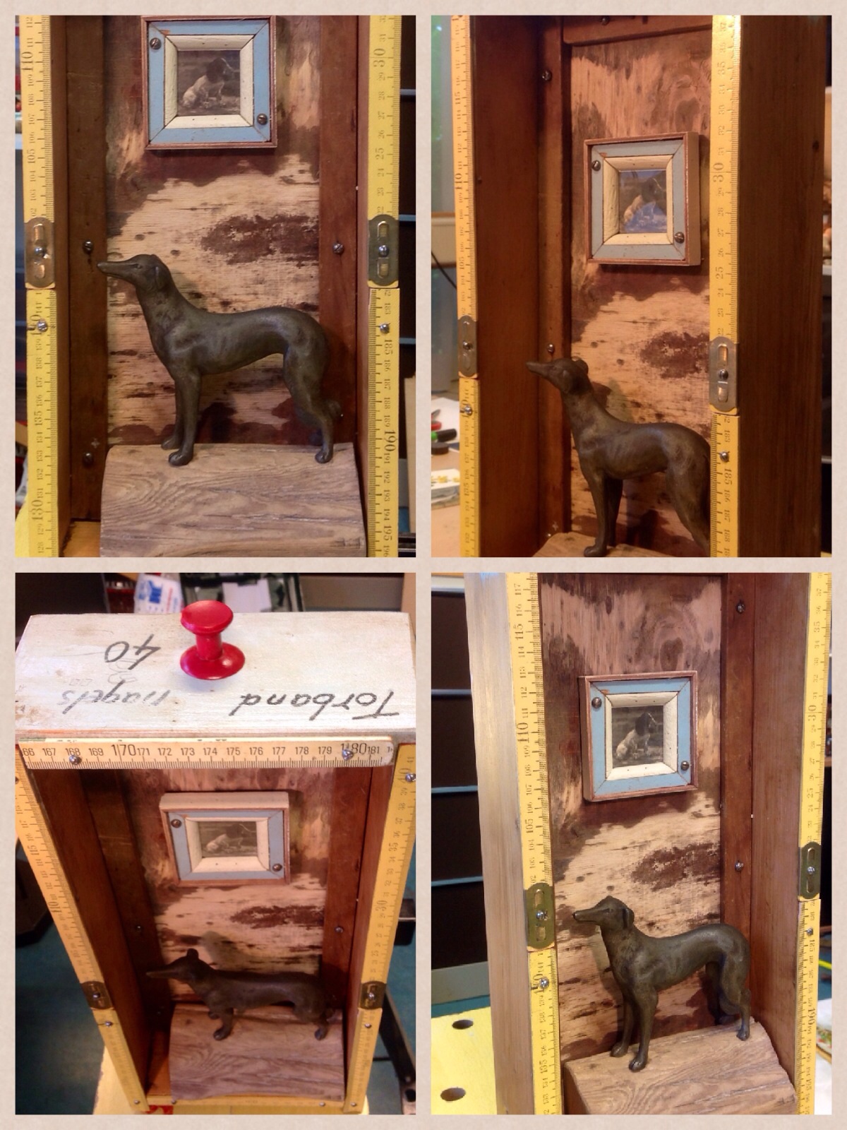 Assemblage Willem I. Named after the dog Willem that became my friend. And I have the privilege to take him out occasionally. 20x40cm. Driftwood, picture from flea market Guise-France and art deco dog found on the street as a part of a broken clock.