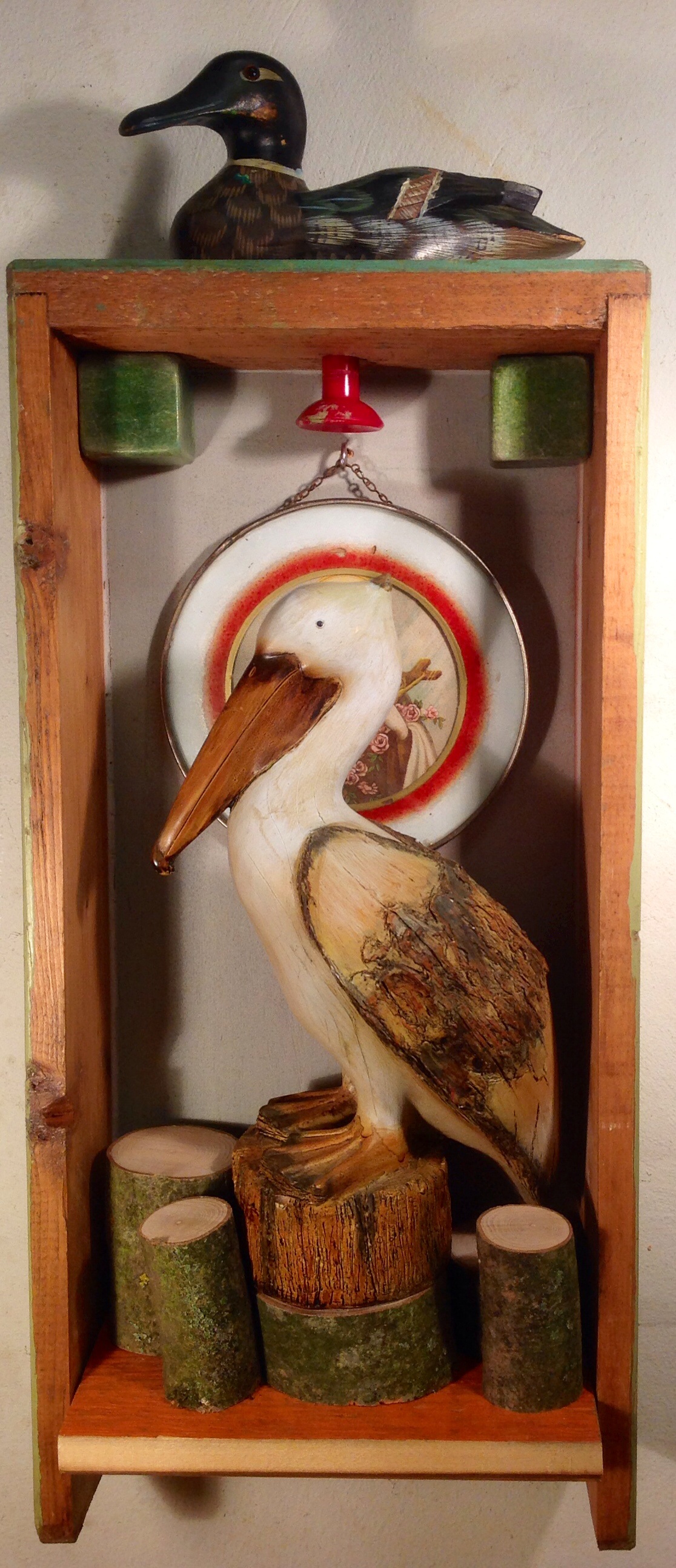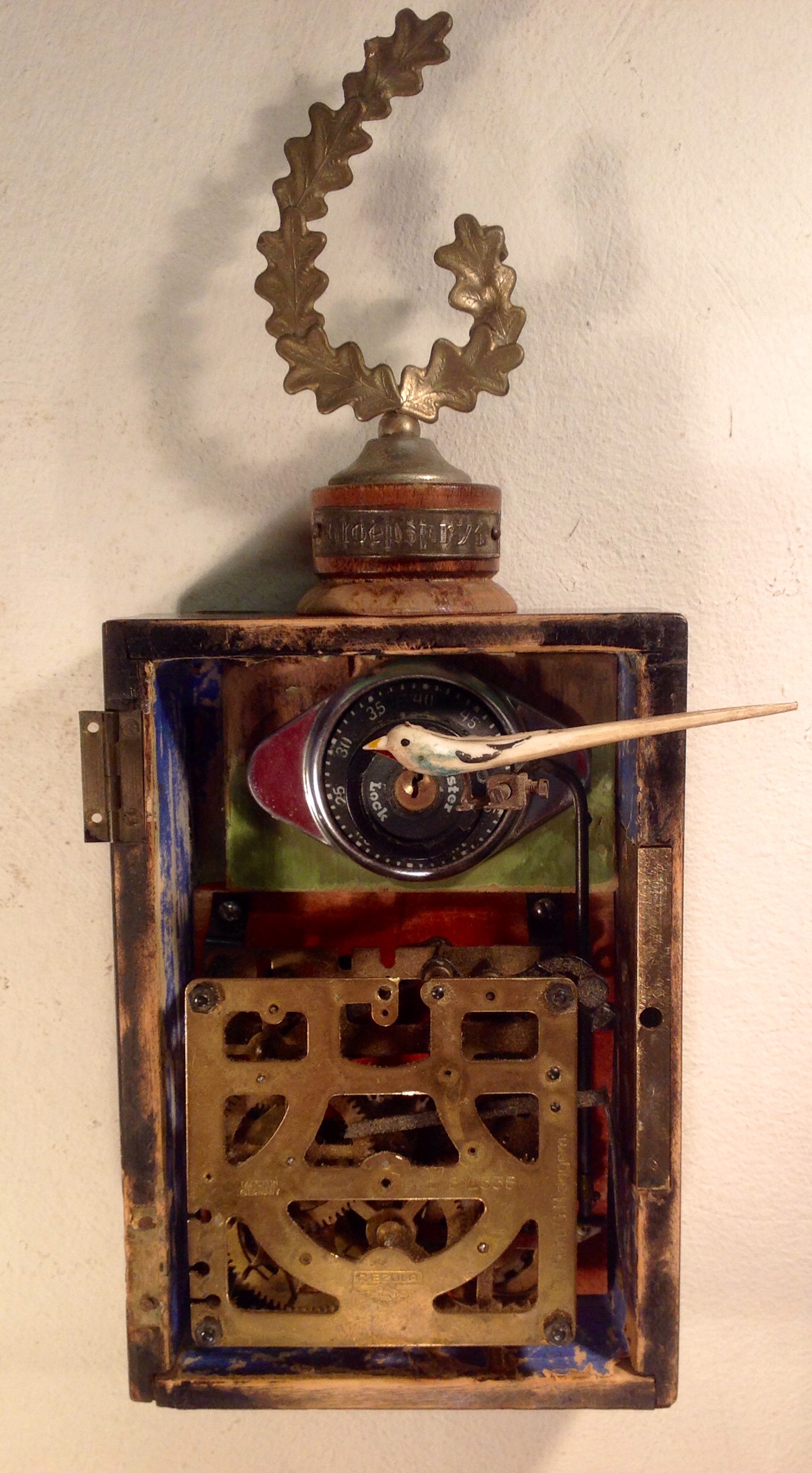 Assemblage in an old wooden box from a fifties carpenter working place. With a wooden puzzle, picture from Living Birds of the World, second printing 1965, Talens paint bottles, wooden toys etc. 20x40cm.