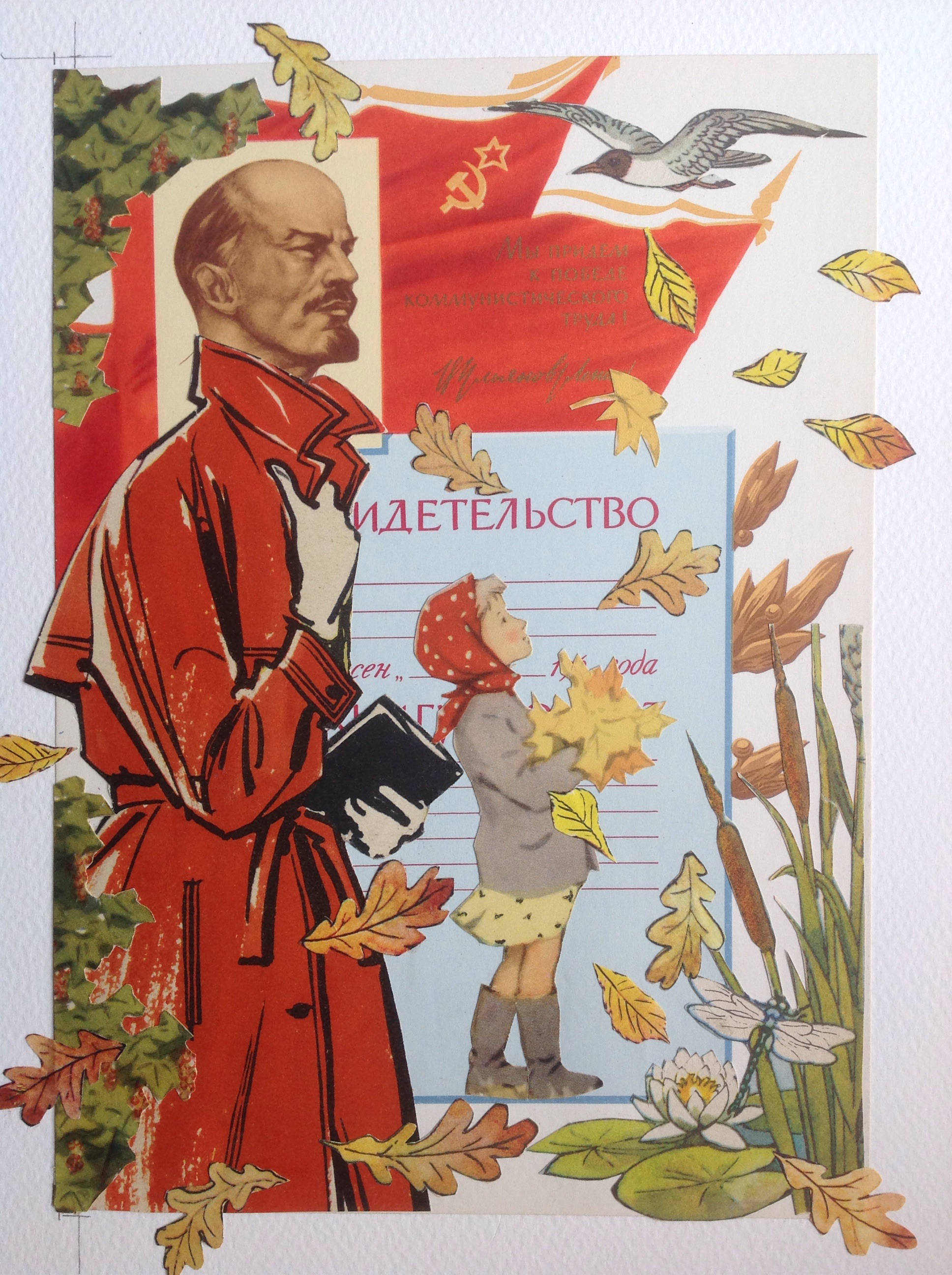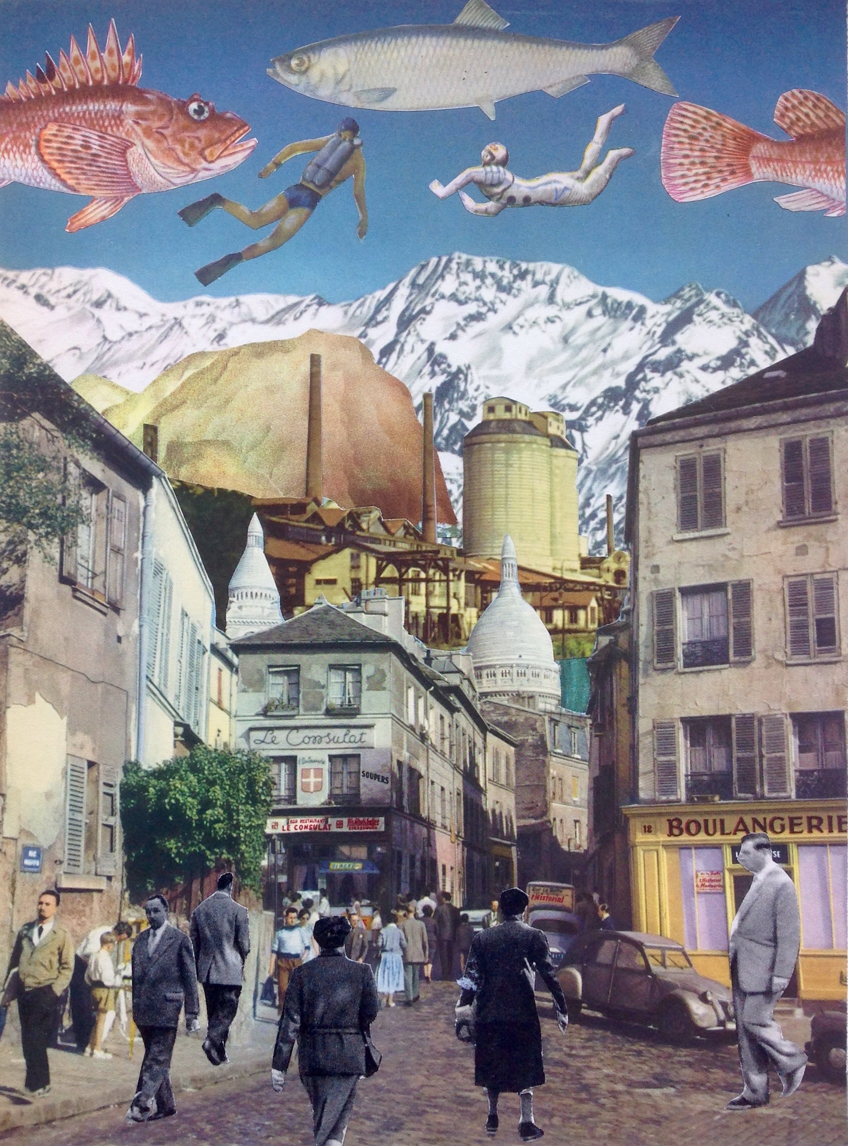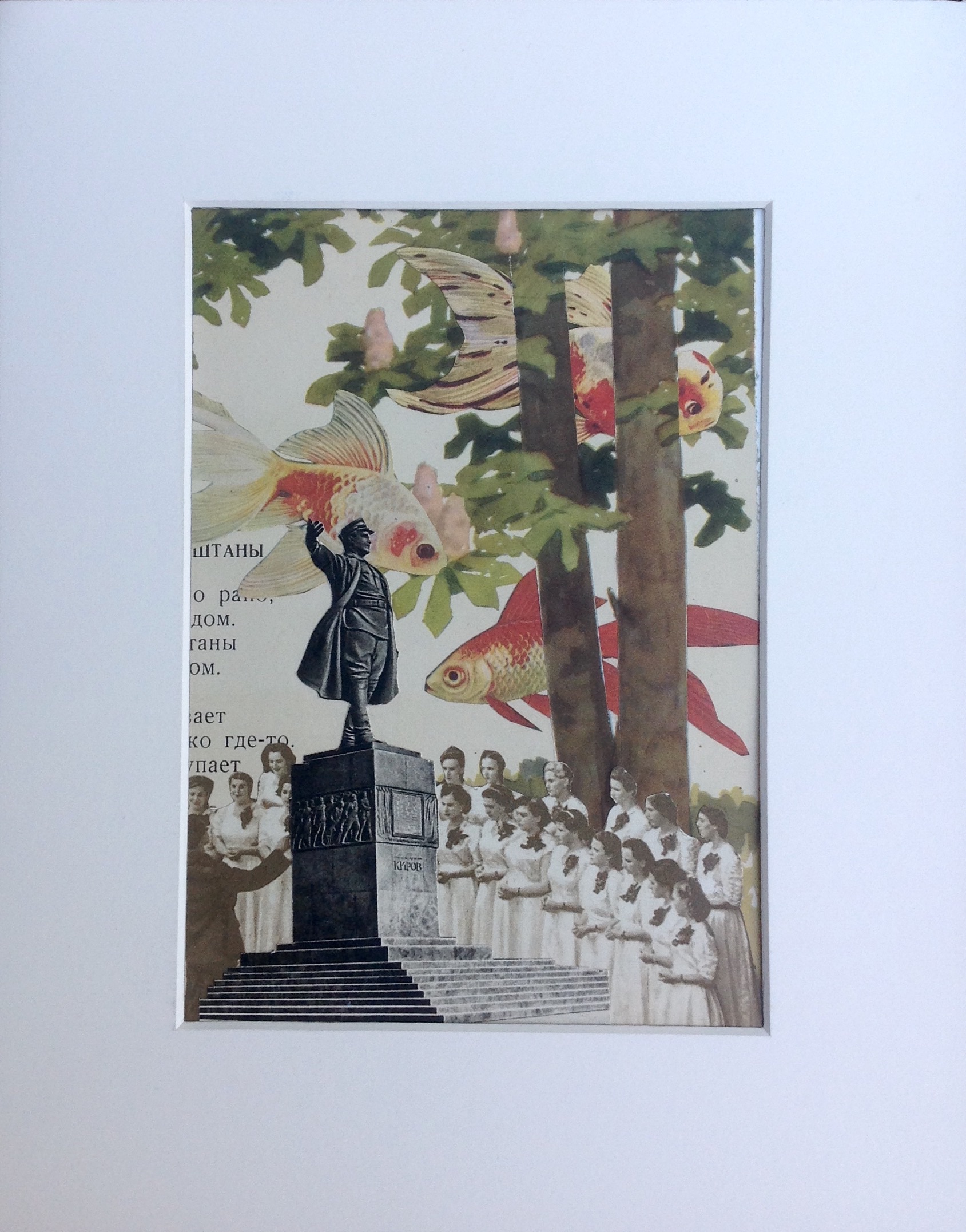 I thought I had it all figured out. All the images were spread out. Part of a building from Lvov from a 1958 book, pieces from a few Russian books for children, fish from an aquarium book and a few from a cook book. Afterall I needed a few hectic hours. 19x27cm.