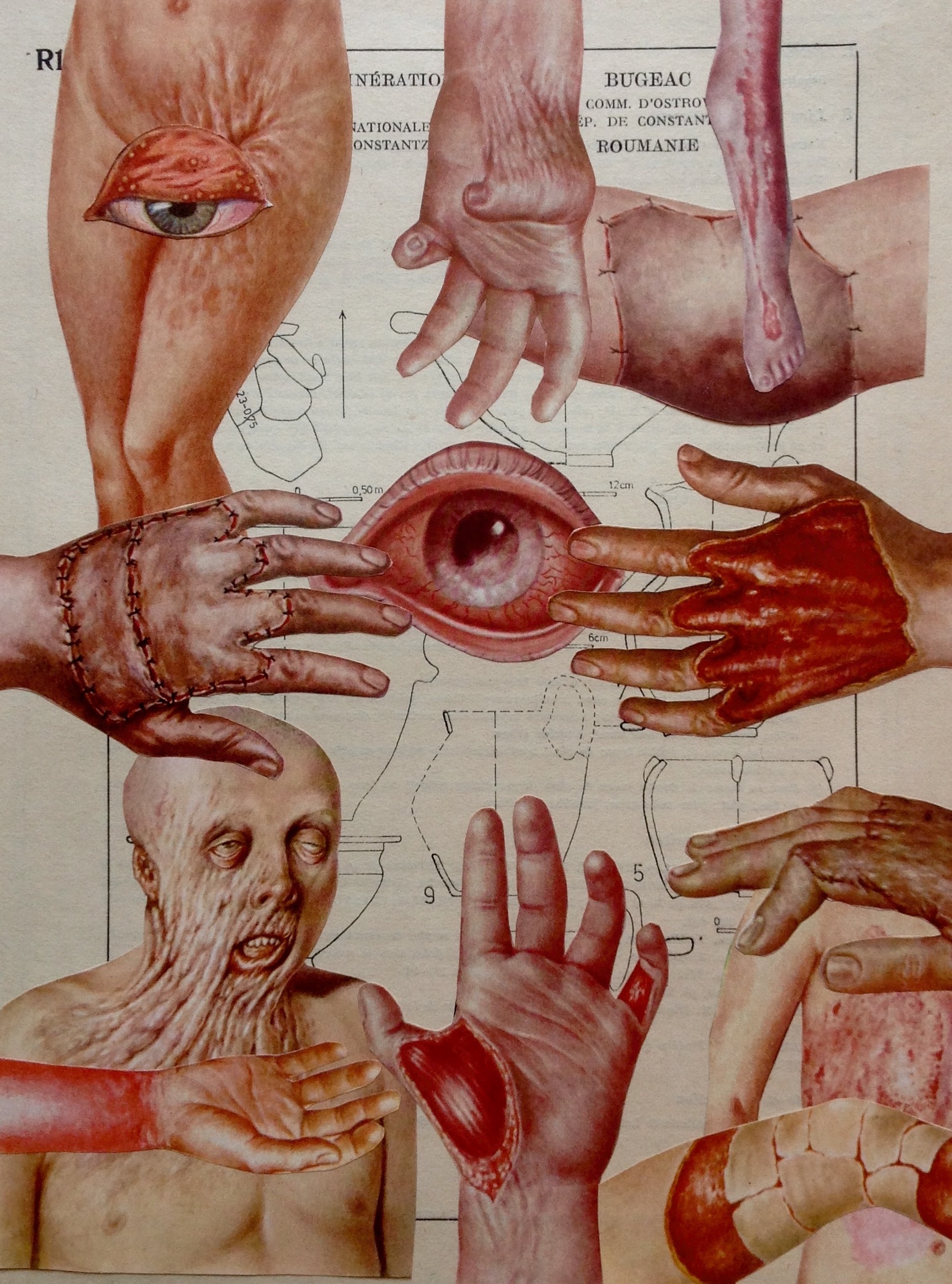 Books from Chisinau-Moldova and Odessa-Ukrania. The block prints are from a Russian story book supposedly full of evil. The fish are from a cookbook, the eyes from a book about eye diseases and the feet from Treatment of Burns and it’s Consequences. 19x27cm