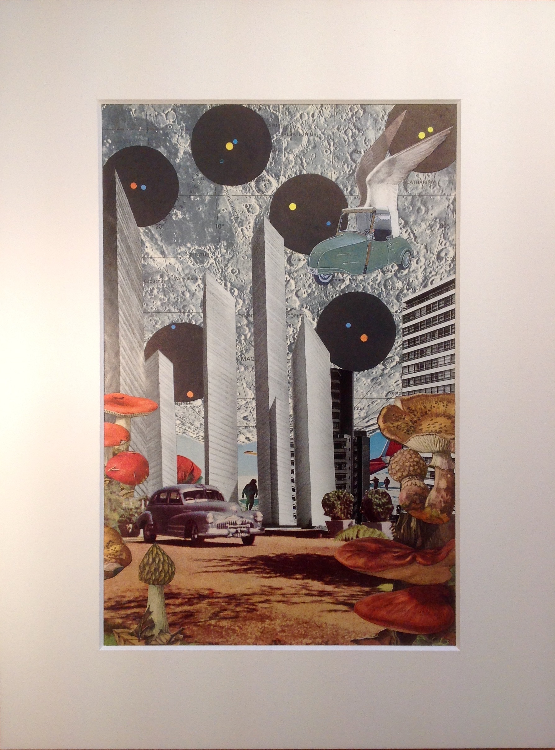 Images of Australia, Mexico and America blended together with a background from a sixties atlas and pieces of the book Astronomie voor Iedereen and mushrooms from the book Paddenstoelen from Thijsse. Handmade collage. Passe-partout 30x40cm and 19x29cm cut out.