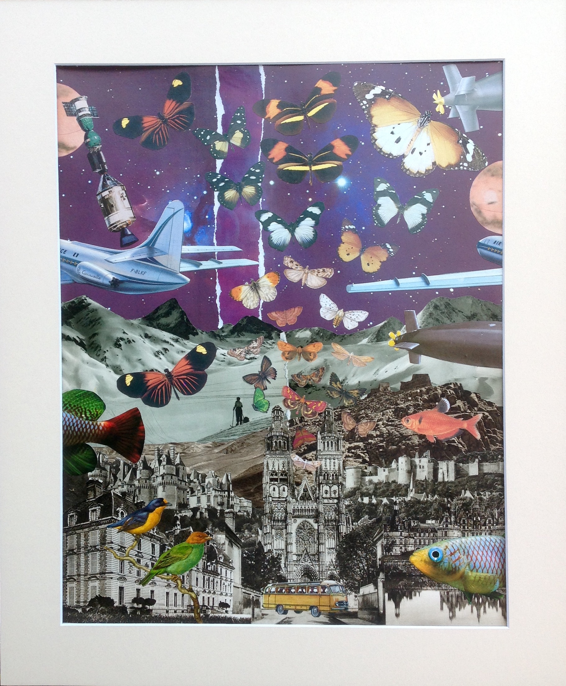 Big sized handmade collage. 50x60cm. (20x24inch). Made on 320grams Botticelli paper, Talens Rembrandt medium gel glue and sprayed with Liquitex satin varnish as a uv-protection. Caravelle is the name of the plane used in the collage. It’s from a wonderfully illustrated French childbook from the sixties. I bought it in Gedinne (Ardennen-Belgium) while I was there in September 2015 with my little dogfriend Willem.
