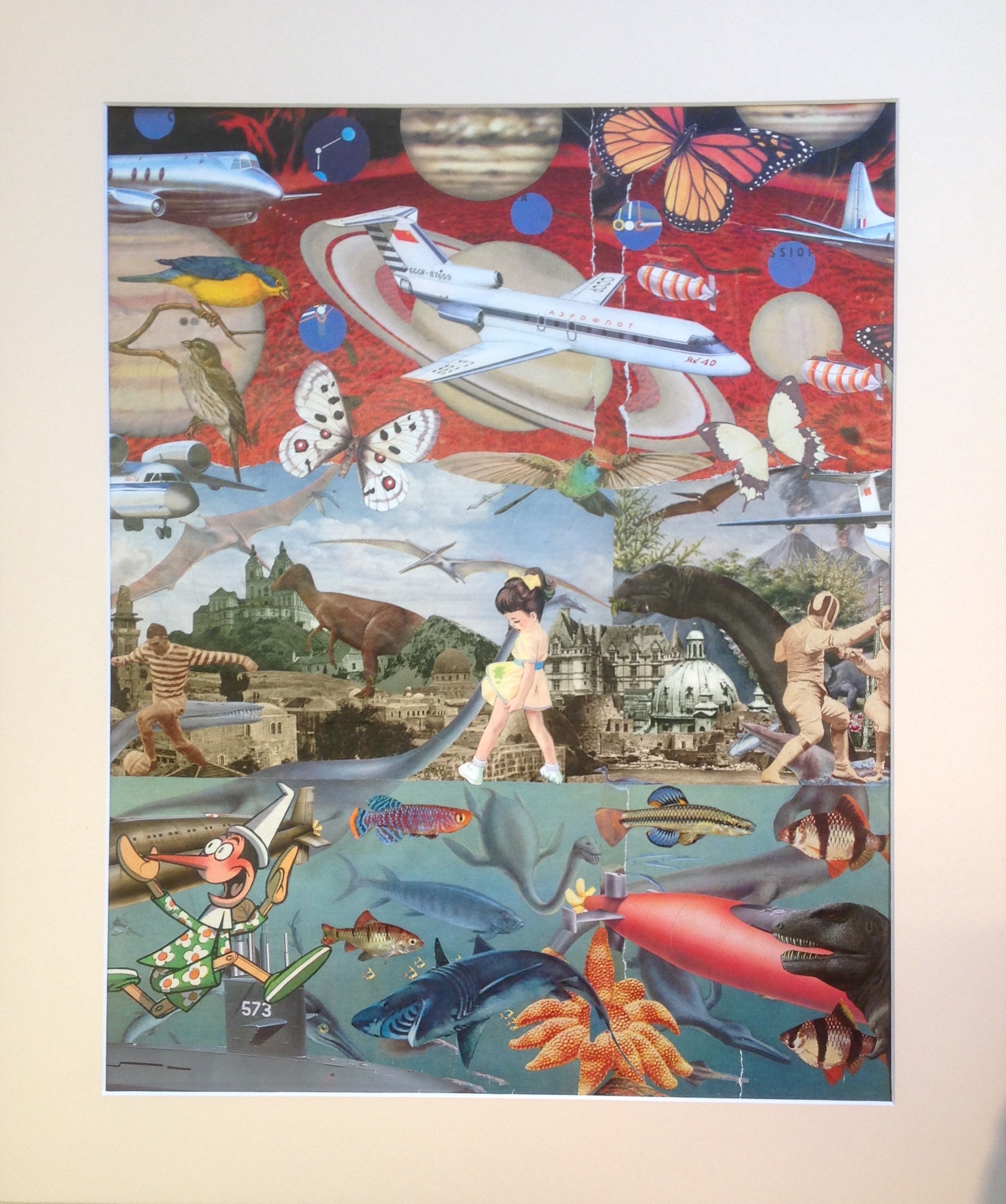 Yakovlev-40 is the name of the plane central in the upper part of the handmade collage. 50x60cm (20x24inch). The base is formed by illustrations from The World We Live in from the fifties. Another forty pieces were added from various old books and magazines.
