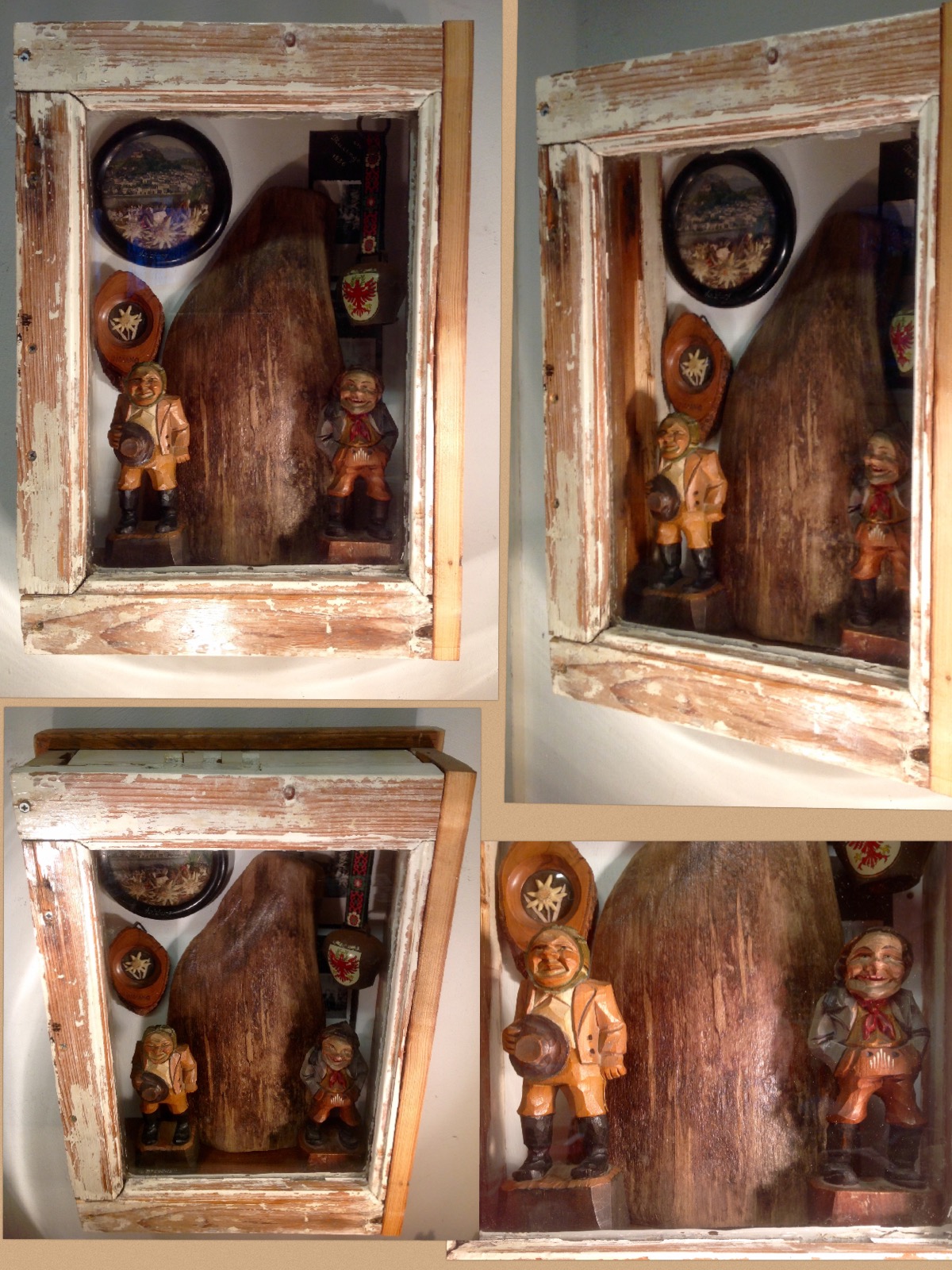 The title refers to two pictures taken from a album of 1959. The pictures are placed in a corner and are hardly visible on the pictures. Assemblage include two wooden souvenir men from Austria, a cow bell from Tirol and other souvenirs.