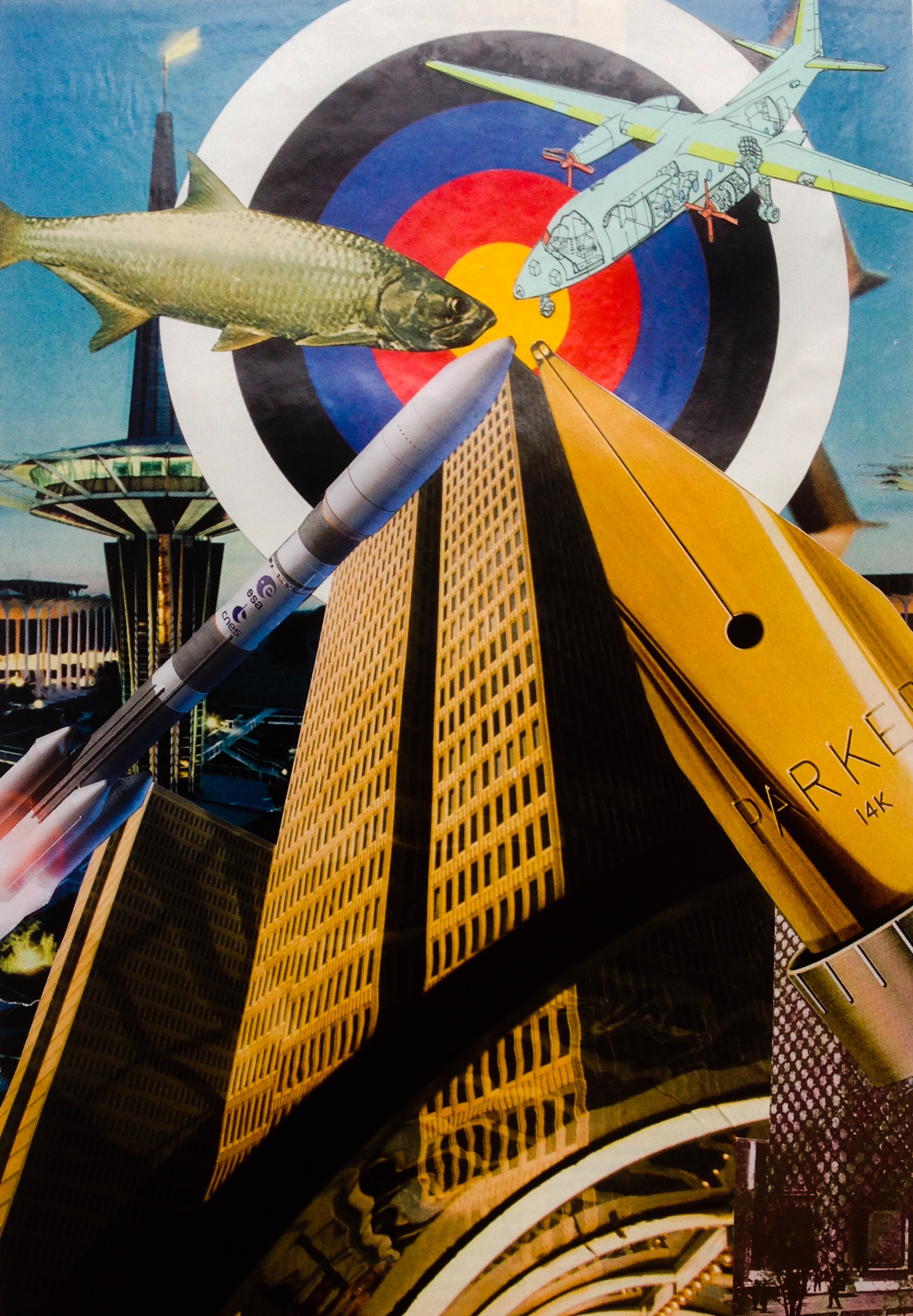 Made this one with a magazine found in a hotelroom and a book bought for 300 forint (1 euro) in the Keleti Station in Budapest. (19x27cm-8x11inch). Eger is the name of the city in Hungary I traveled to and where I made the collage.