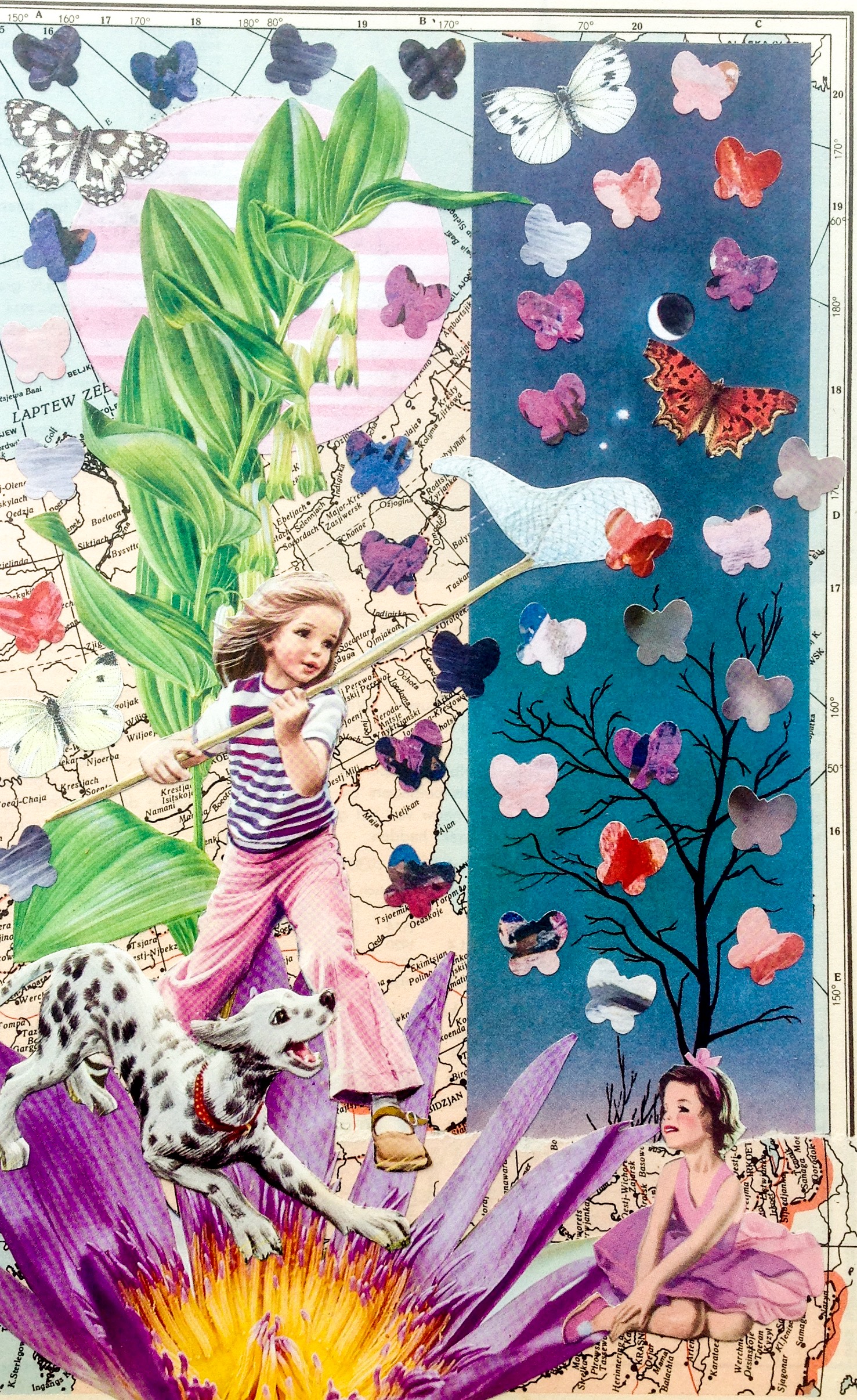 Handmade collage. 20x30cm/8x12inch. With parts of Walt Disney book, Martine series by Casterman, map and several other vintage books.