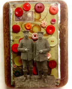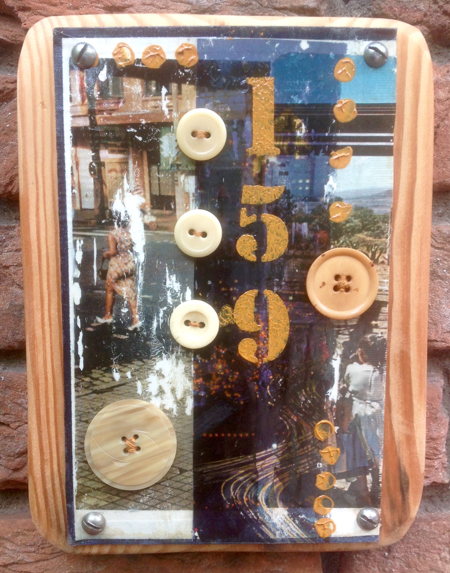 Pigment transfer with buttons and original photo on wooden block. Image screwed on driftwood. 15x20cm/6x8inch.