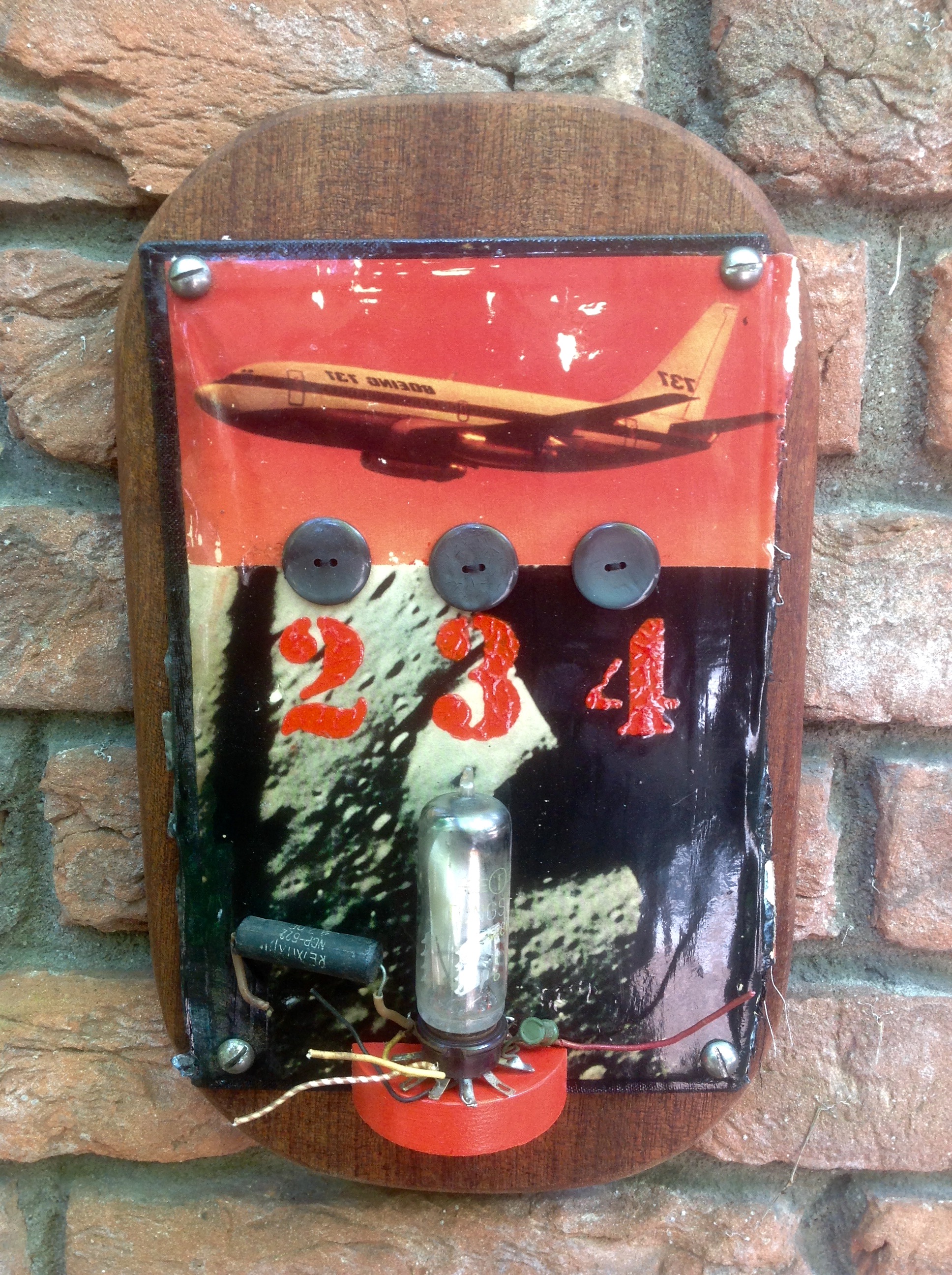 Multiple pigment transfer on hard book cover with buttons and numbers in acryl paint with part of a radio. Screwed on wood. (20x30cm).