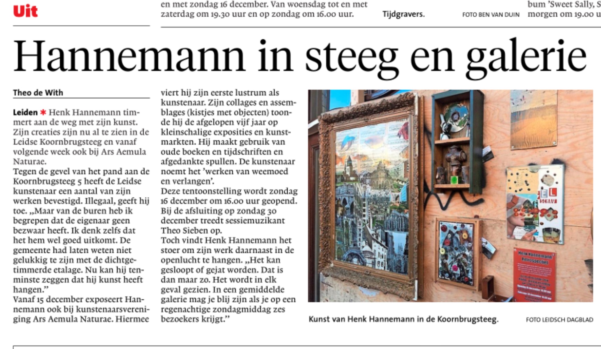 Artikel in het Leidsch Dagblad van 5 december 2018 december 6, 2018 henkhannemann Een reactie plaatsen Expositie in ARS, Pieterskerkgracht 9a in Leiden. 15 t/m 30 december 2018. Opening 16 december om 16.00 uur en sluiting met gitarist- zanger Theo Sieben op 30 december om 16.00 uur.