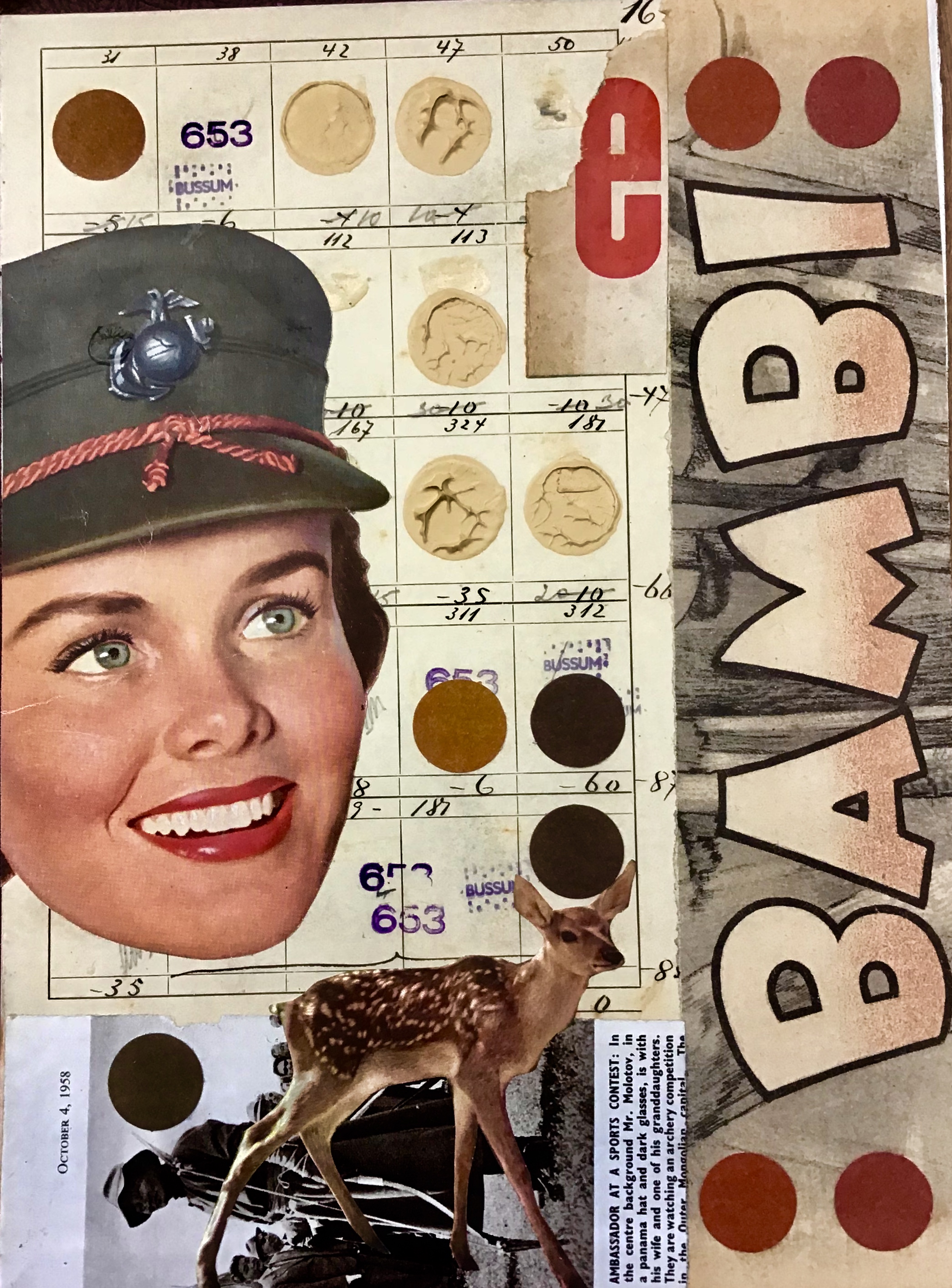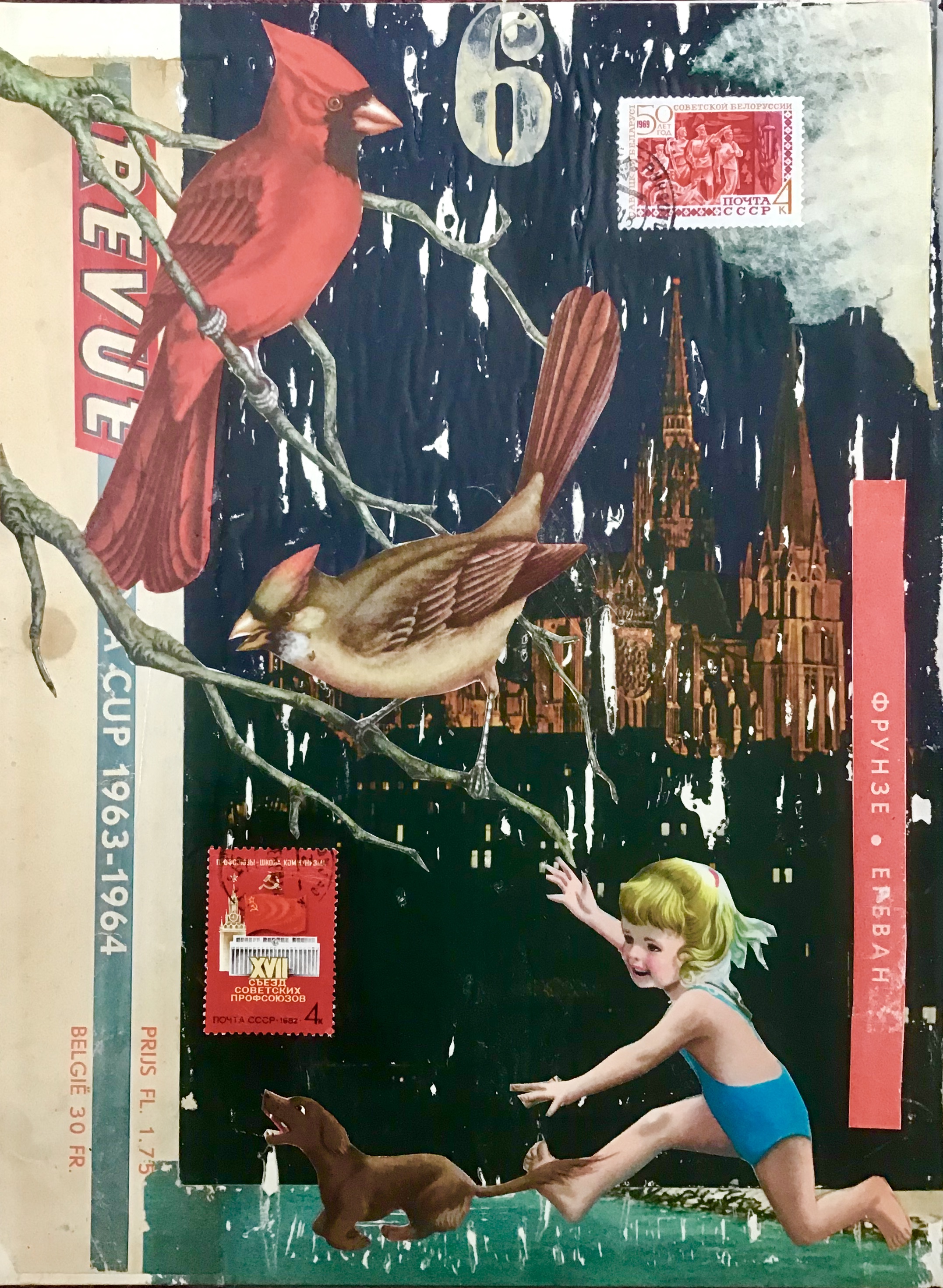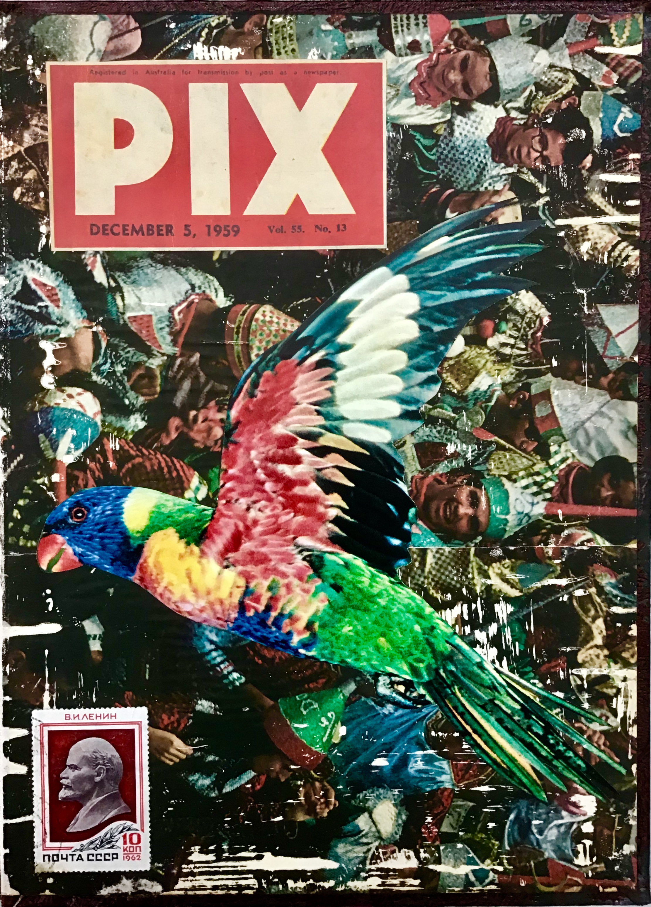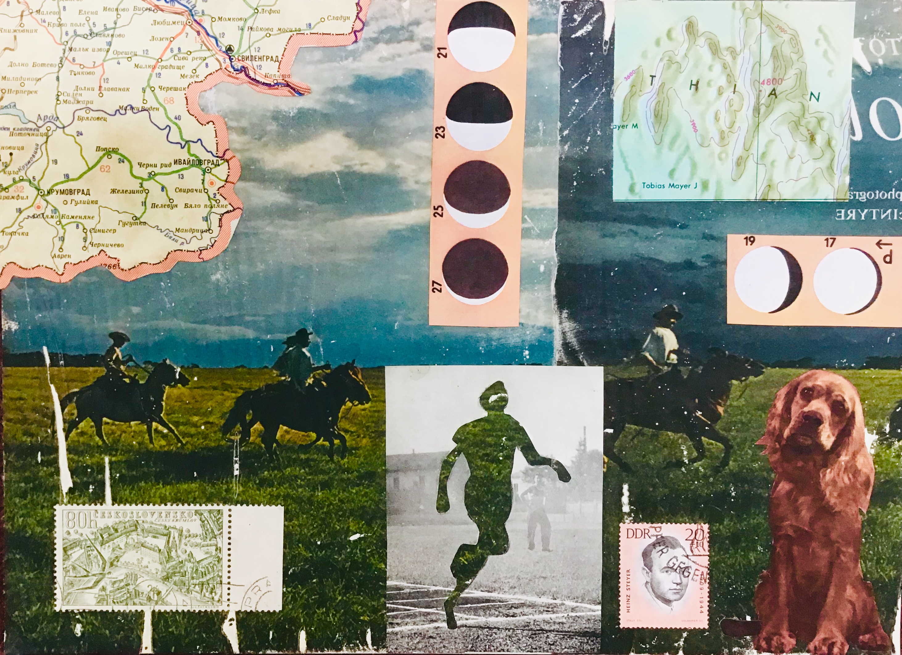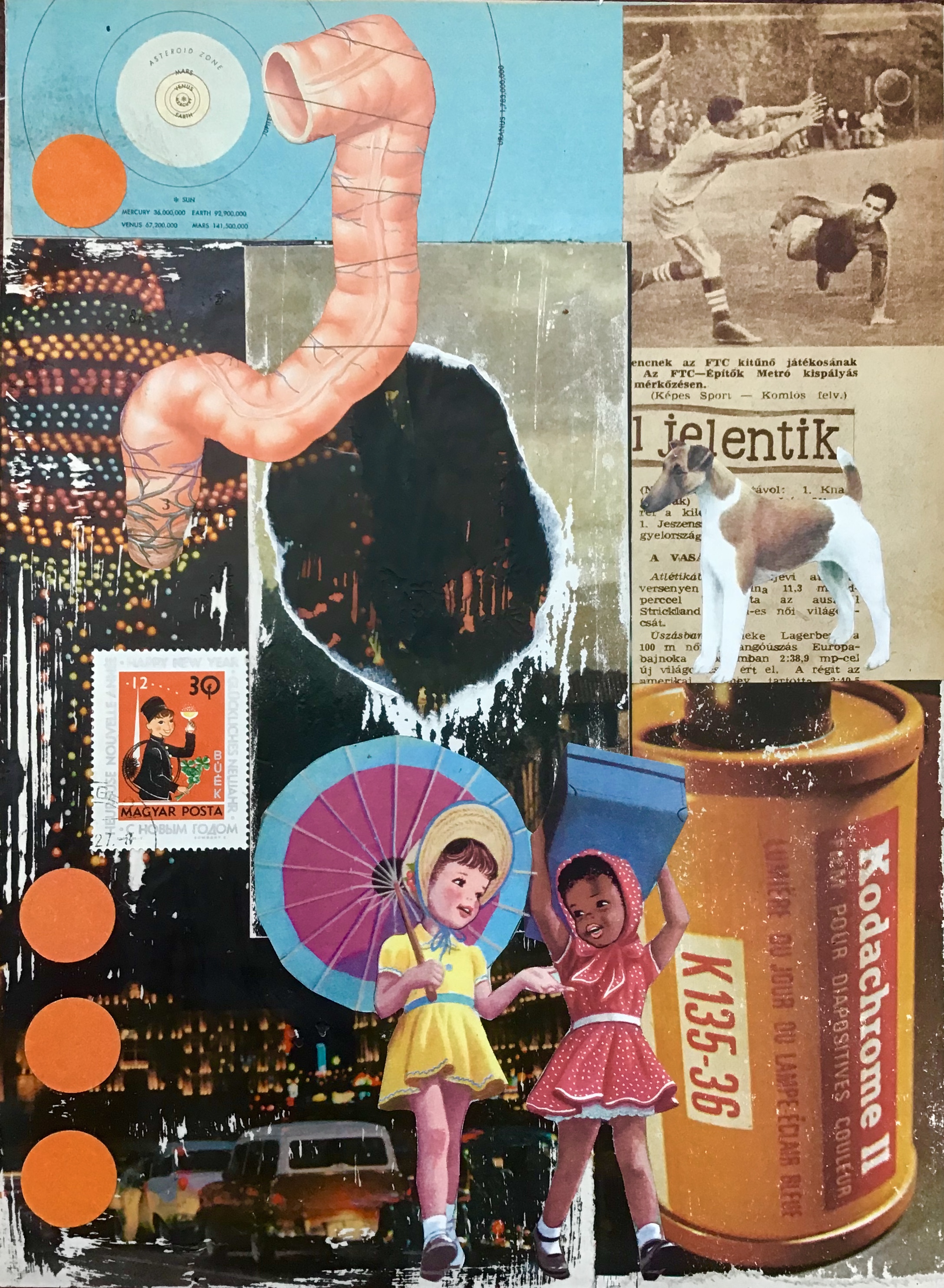 Transfer and collage on hard book cover. 20x28cm. The book covers are from a Encyclopaedia Brittanica from 1955.