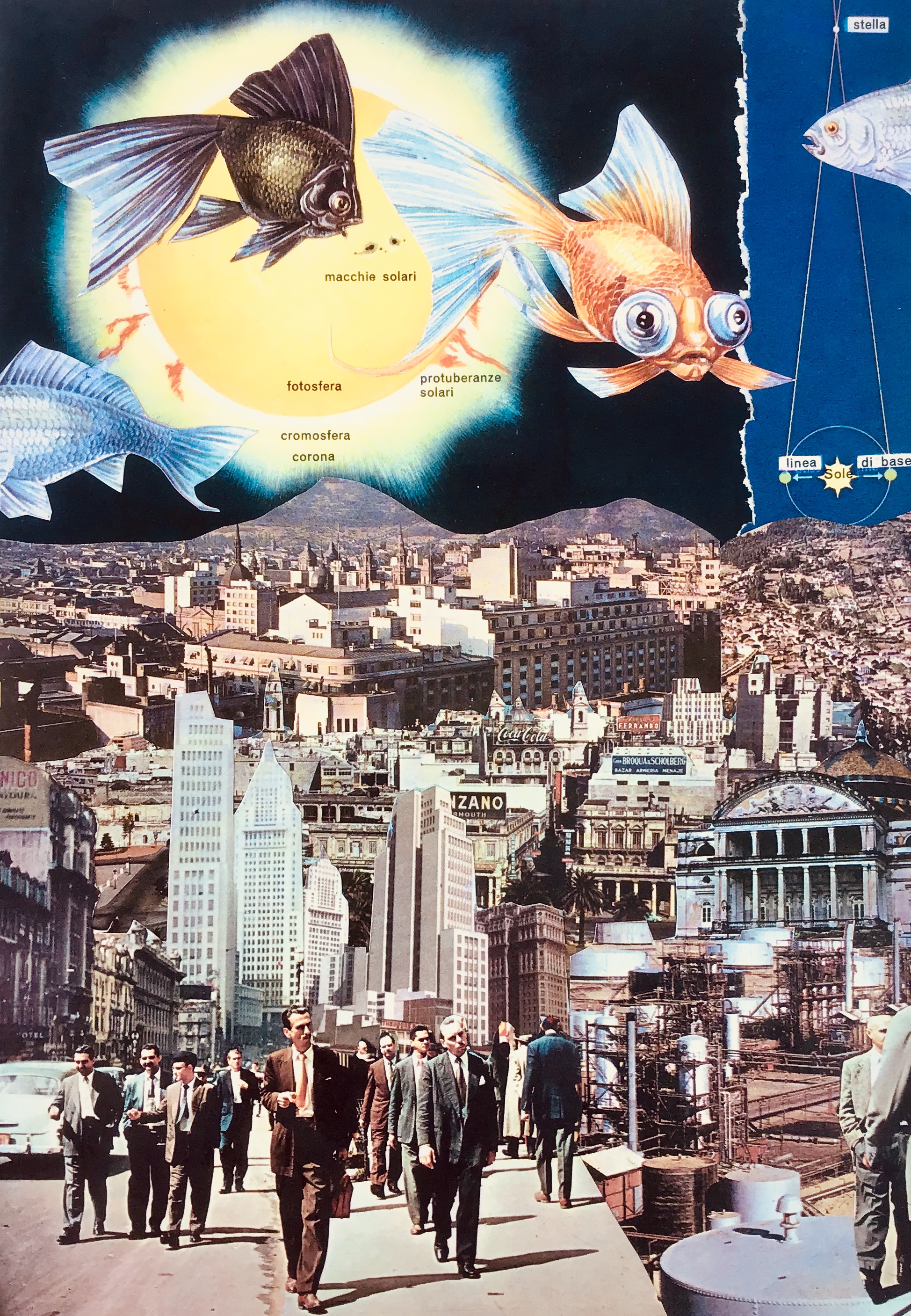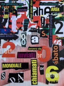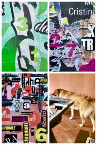 Objects trouvé from the walls of Sardinia and from mr. David Carson’s cover of De Volkskrant Magazine of the Netherlands. Each collage is 19x27cm. The last image is my studio stray dog in a wonderful place in Sardinia where I am the only customer at the moment. (Click to enlarge).