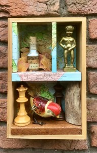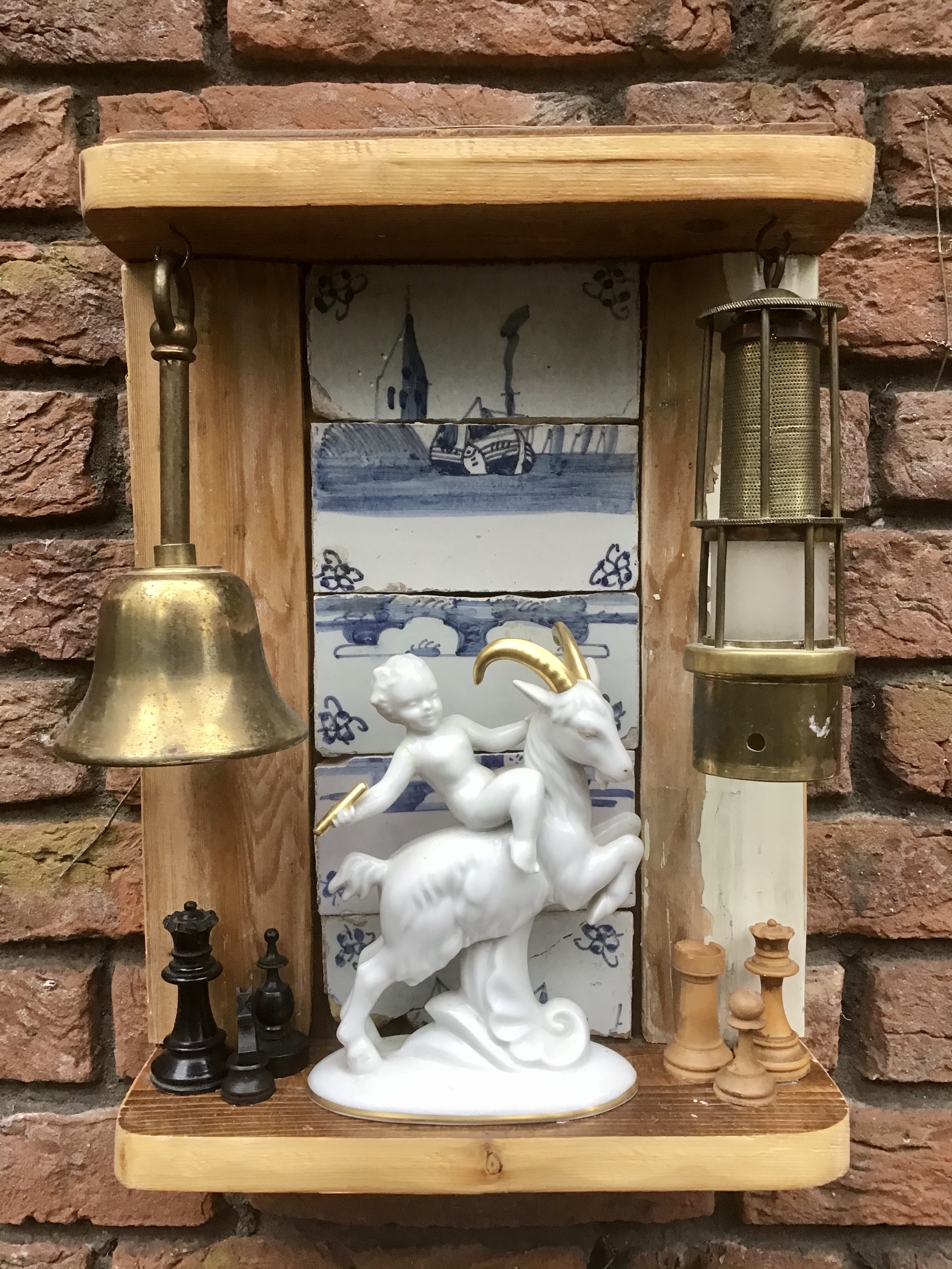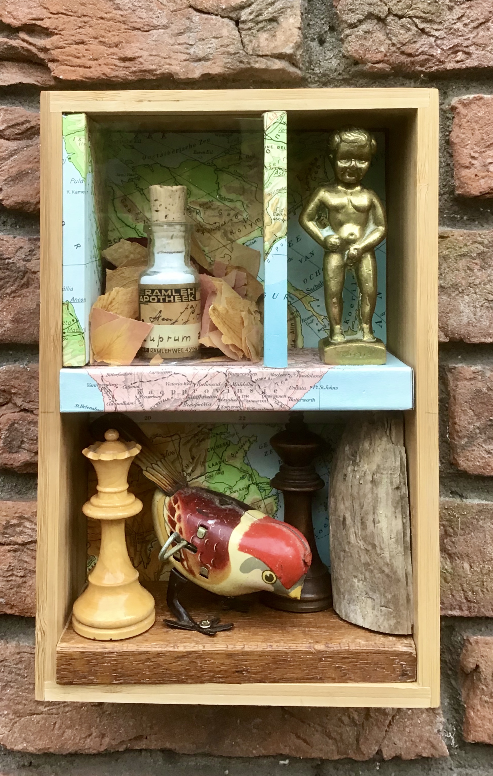 Assemblage made of vintage items like an old archive drawer, various pieces of wood, copper, chess pieces and Delfts blue tiles. The little boy probably has to do with Greek mythology.
