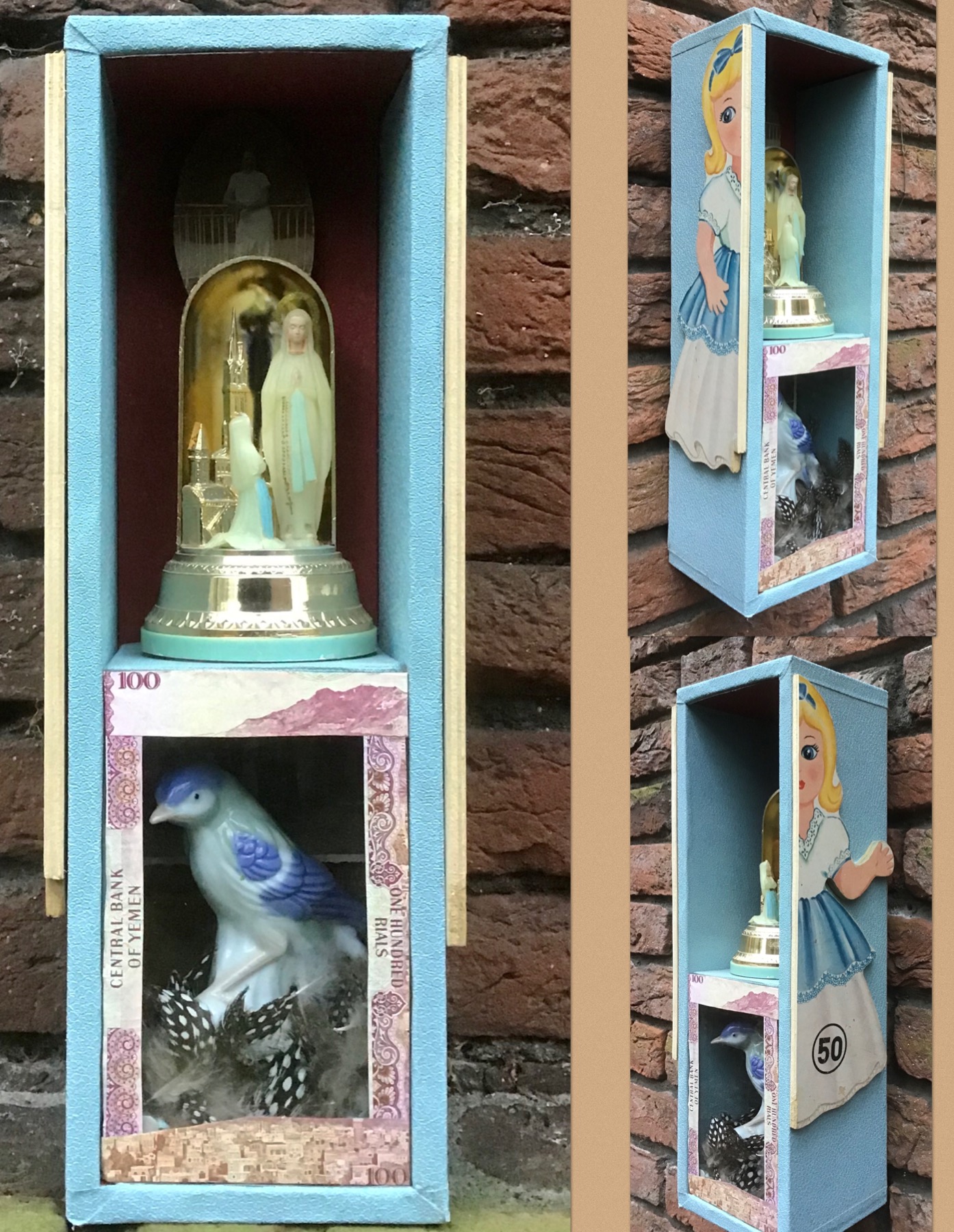 Blue Heaven januari 22, 2020 henkhannemann Een reactie plaatsen Assemblage in old wine box with vintage items. Below is a ceramic bird with real feathers behind glass.
