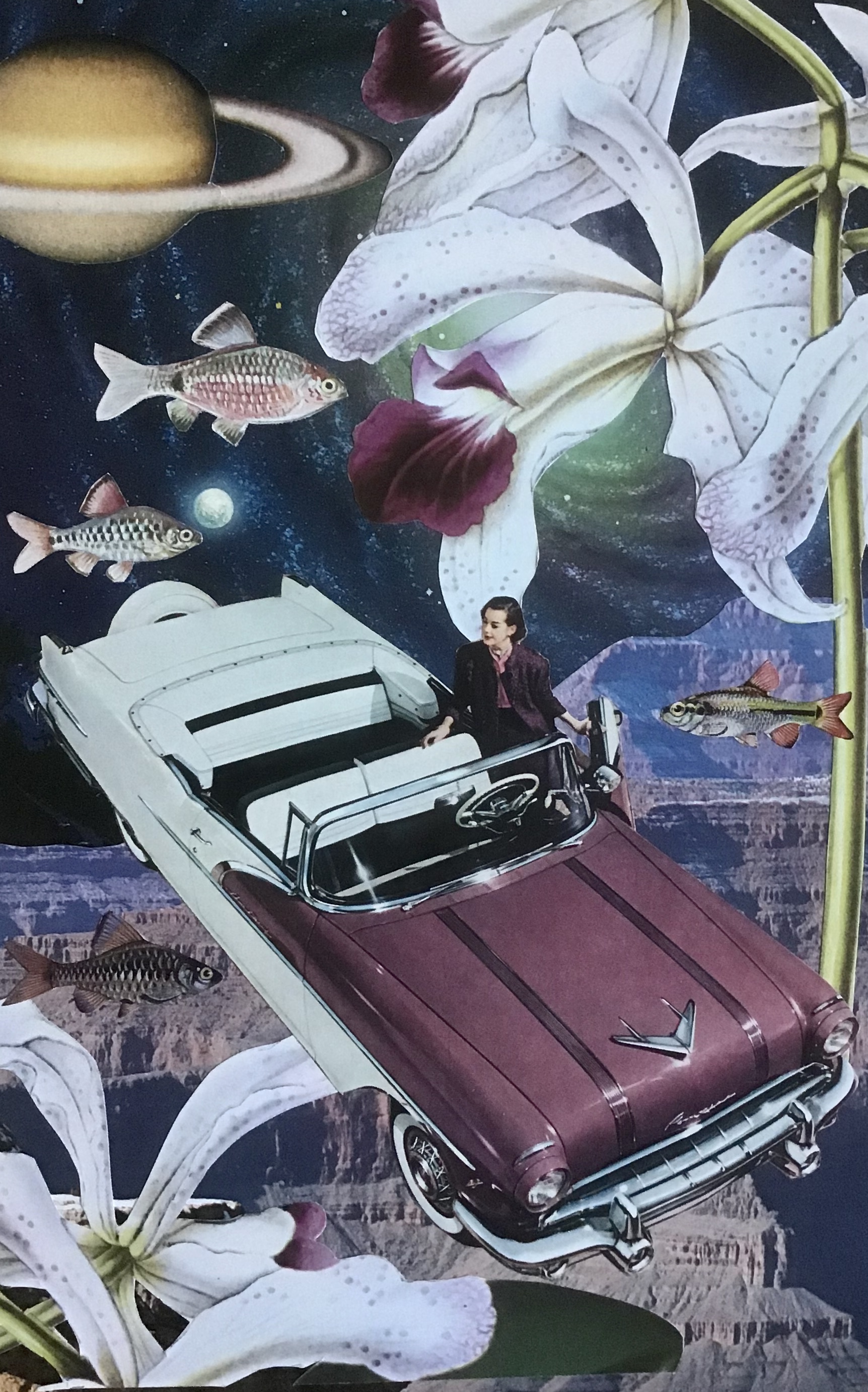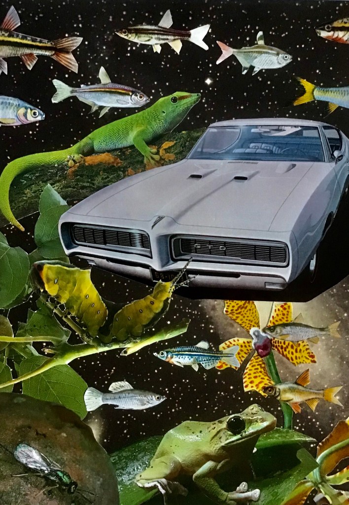 Analog collage with central a Pontiac GTO 1968 from an advertisement in a National Geographic from 1968. 19x29cm.