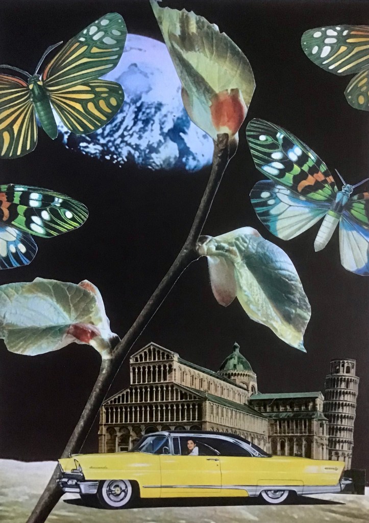 Analog collage with a ‘56 Ford from a National Geographic from 1956 in a green atmosphere from a German encyclopedia from 1874 and parts of picture postcards from the thirties from Pisa. 19x29cm.