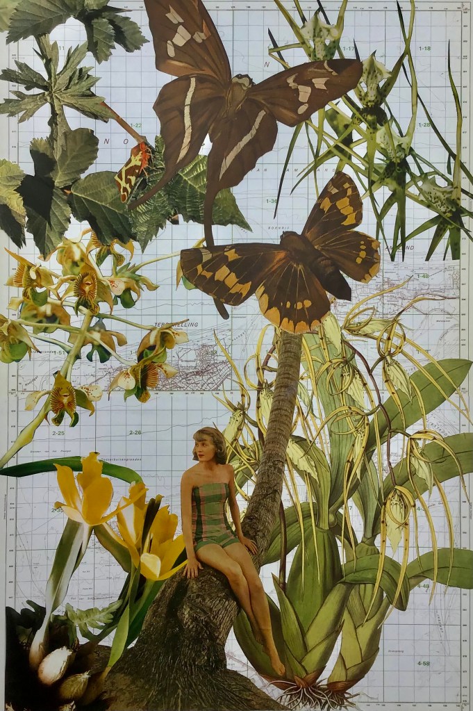 Large collage (40x60cm) with vintage map and materials on 300 grams watercolor paper.