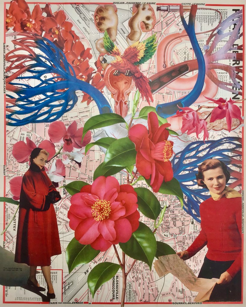 Large analog collage (40x60cm) on map of Rouen and watercolor paper.