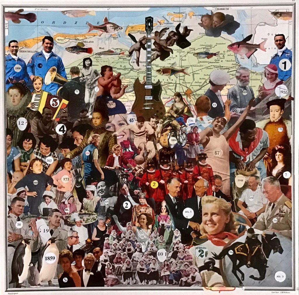Analog collage (35x35cm) made for the Facts & Fears Project as a possible cover for Anne Soldaat’s album cover. With parts of an old Bos atlas and the favorite guitar of Soldaat (Gibson). Visible in the map above is the Loppersum, village he was born in.