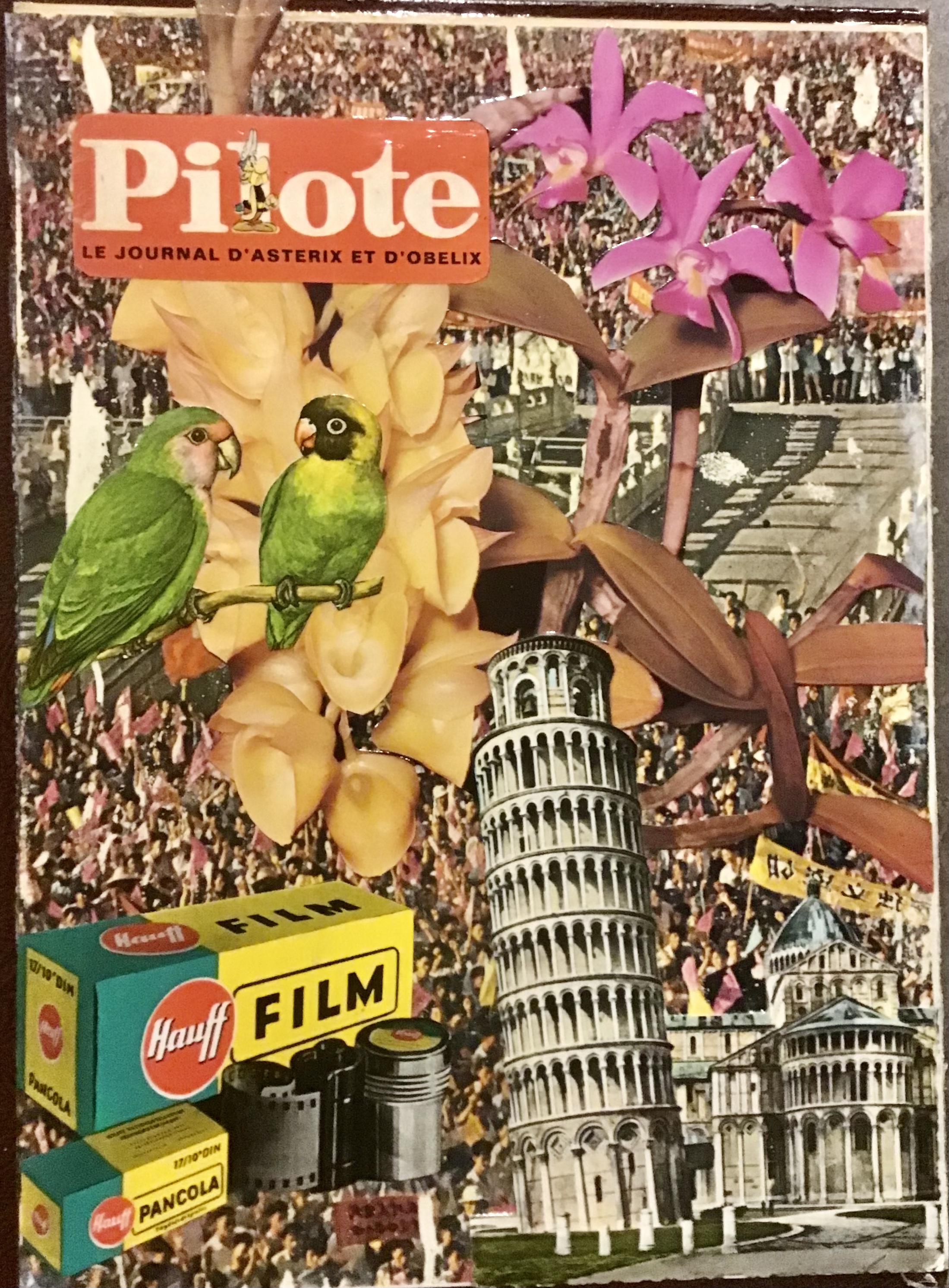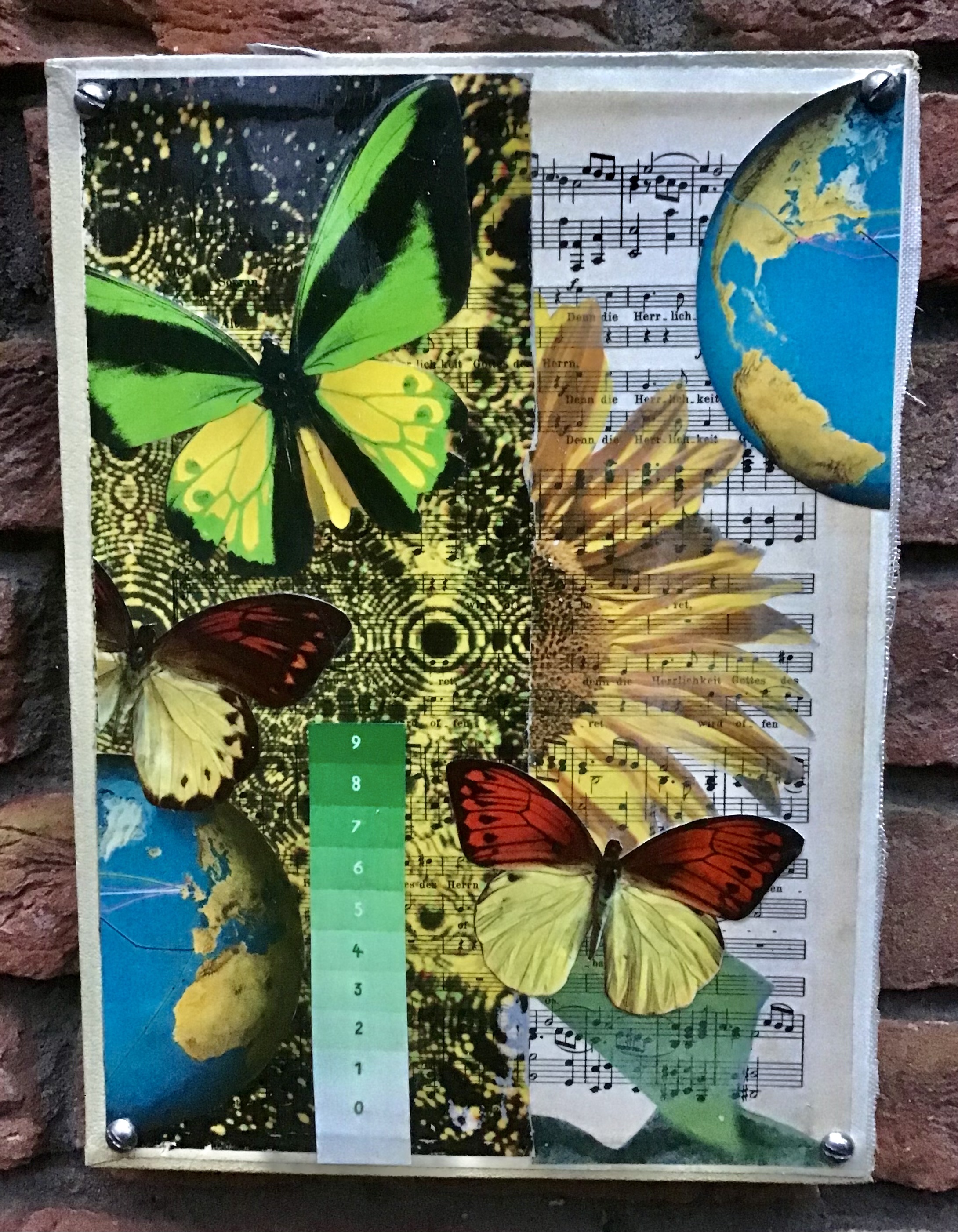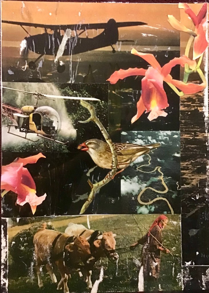 Started in 2022 with a series of mixed media. Pigment transfer mixed with analog collage. Made on vintage book covers of encyclopedia’s from the fifties. Screwed on wood. This work is made with different layers of transfers and collage work. 21x28cm.