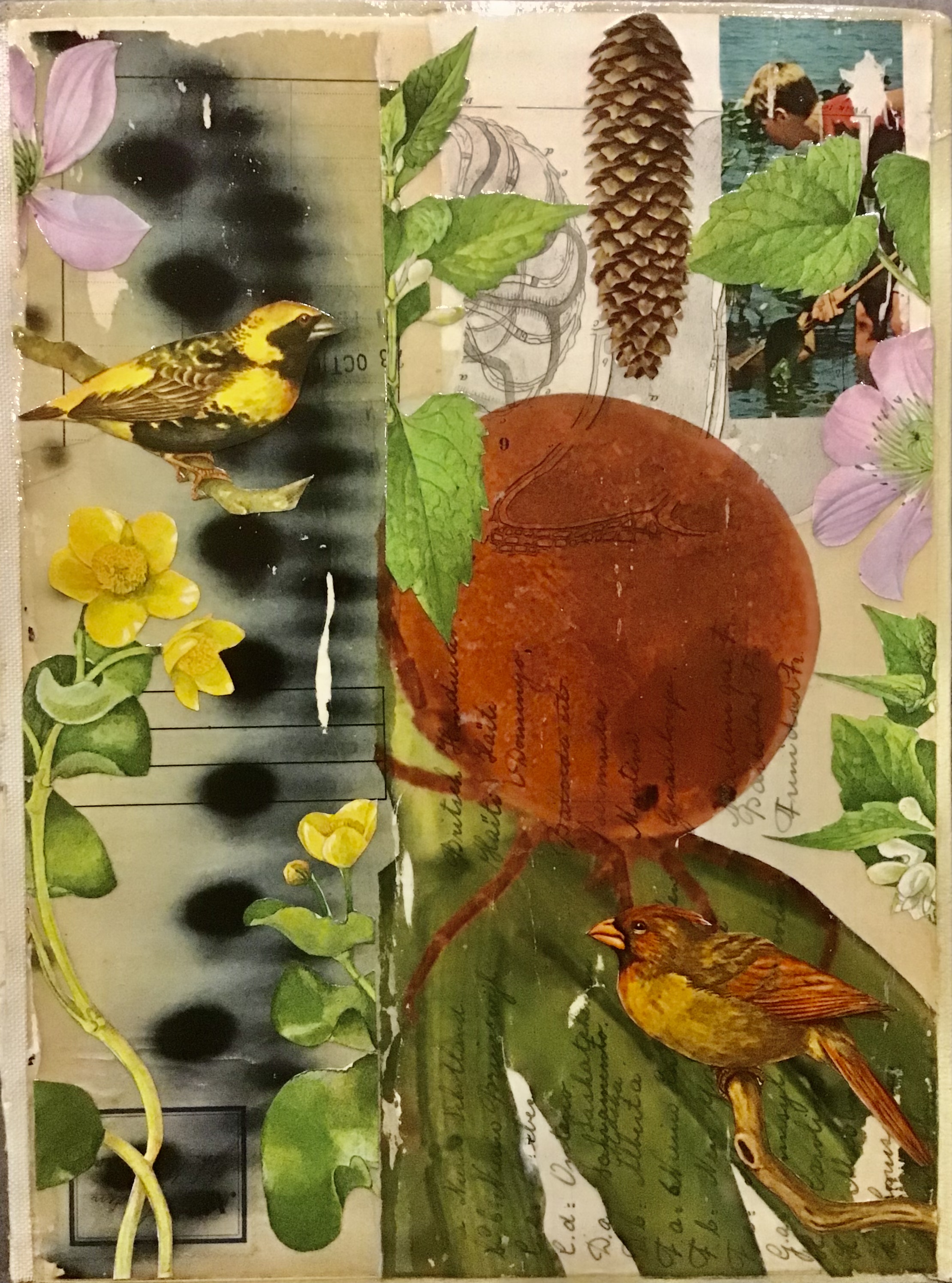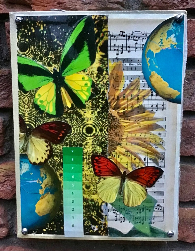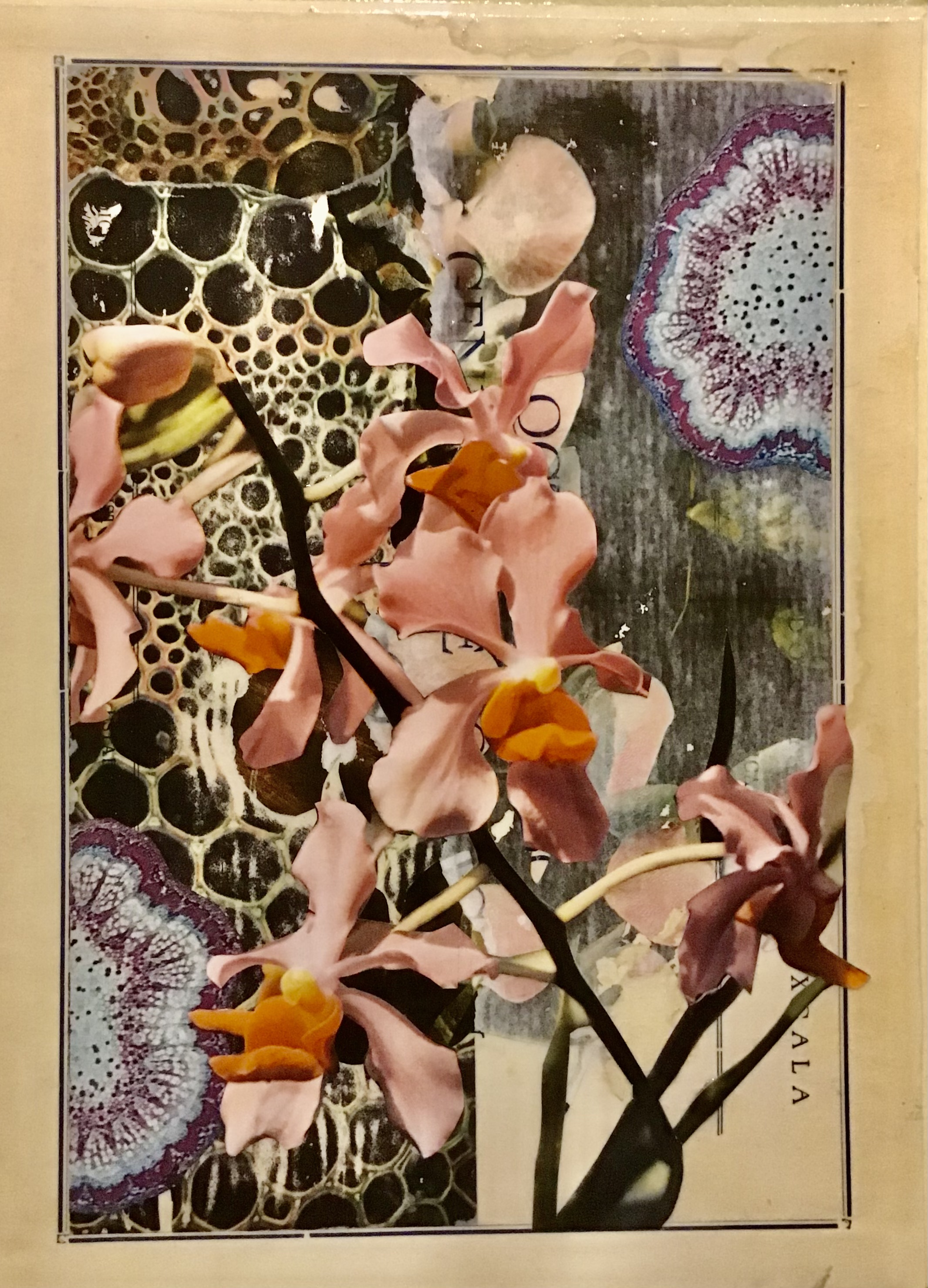 Started in 2022 with a series of mixed media. Pigment transfer mixed with analog collage. Made on vintage book covers of encyclopedia’s from the fifties. Screwed on wood. This work is made with different layers of transfers and collage work. 21x28cm.