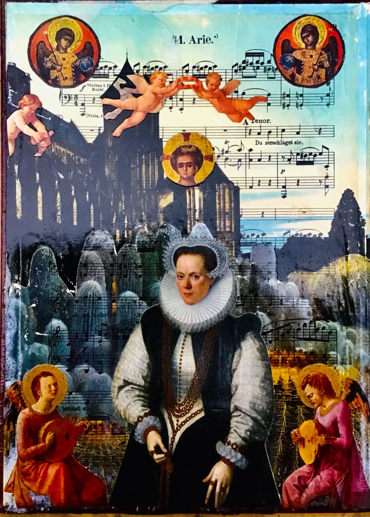 Pigment transfer and collage on vintage book cover. Four layers in this work. Glued a written page of a jubilee book on a vintage book cover. Then a pigment transfer, the third layer is a collage on the transfer and the last is a finish of varnish. 21x28cm.