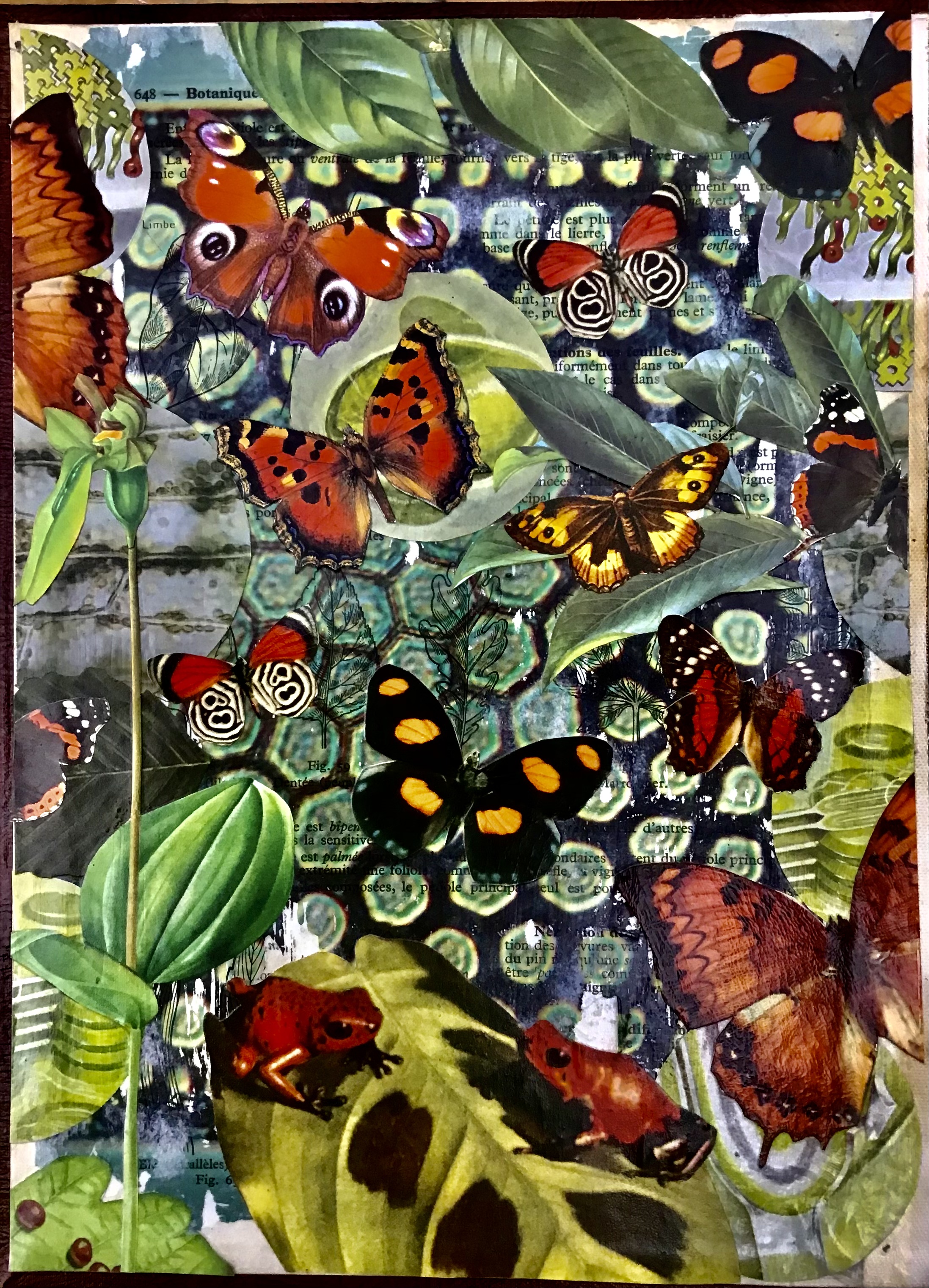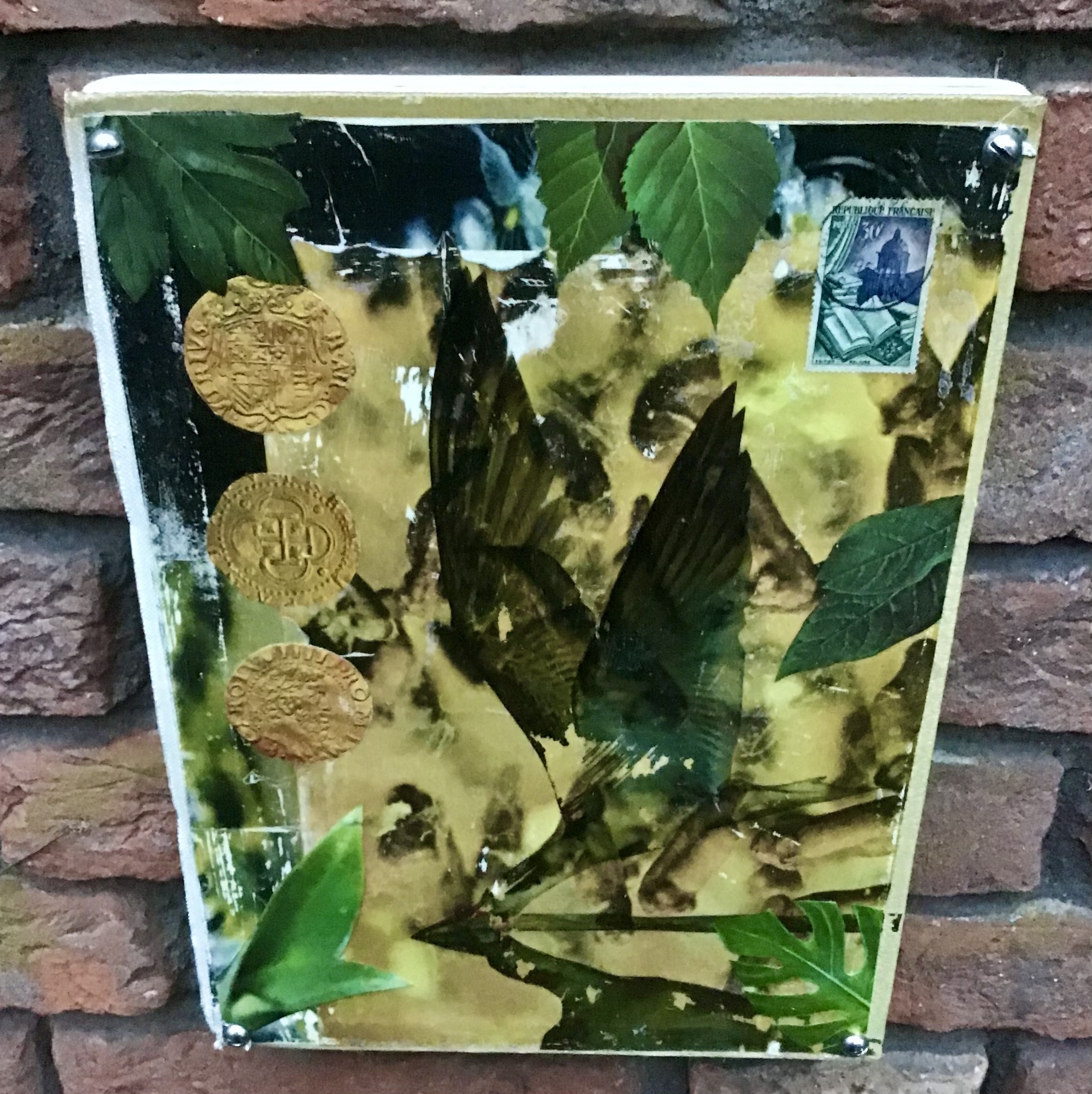 Mixed media. 21x28cm. Pigment transfer and collage on vintage hard cover. Finished with 3 thin layers of varnish. Mounted on wood.