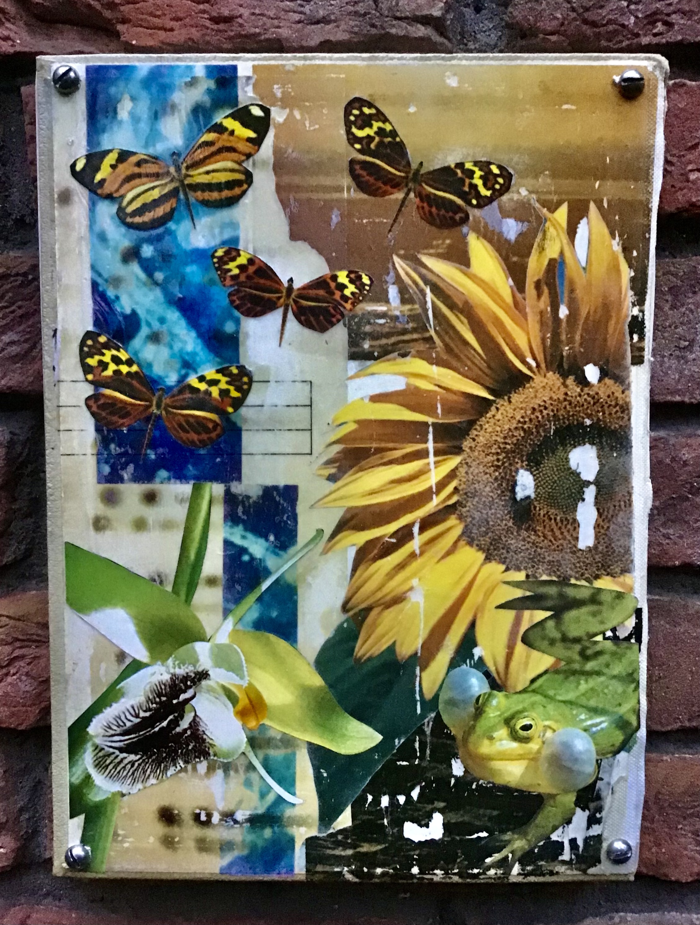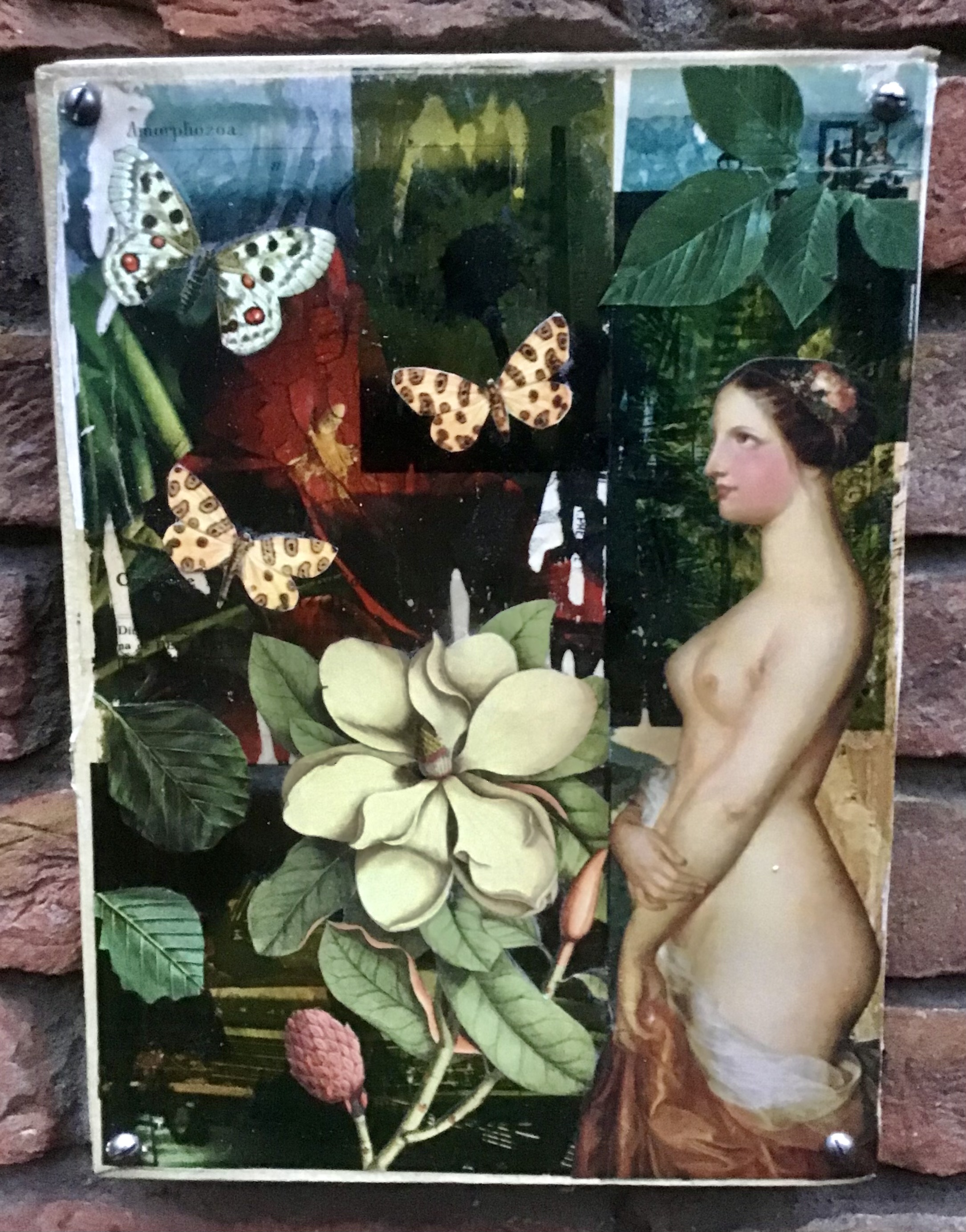 Mixed media. Transfer and collage on hard book cover. Just like all the others mounted on wood with screws from an old piano. 21x28cm.