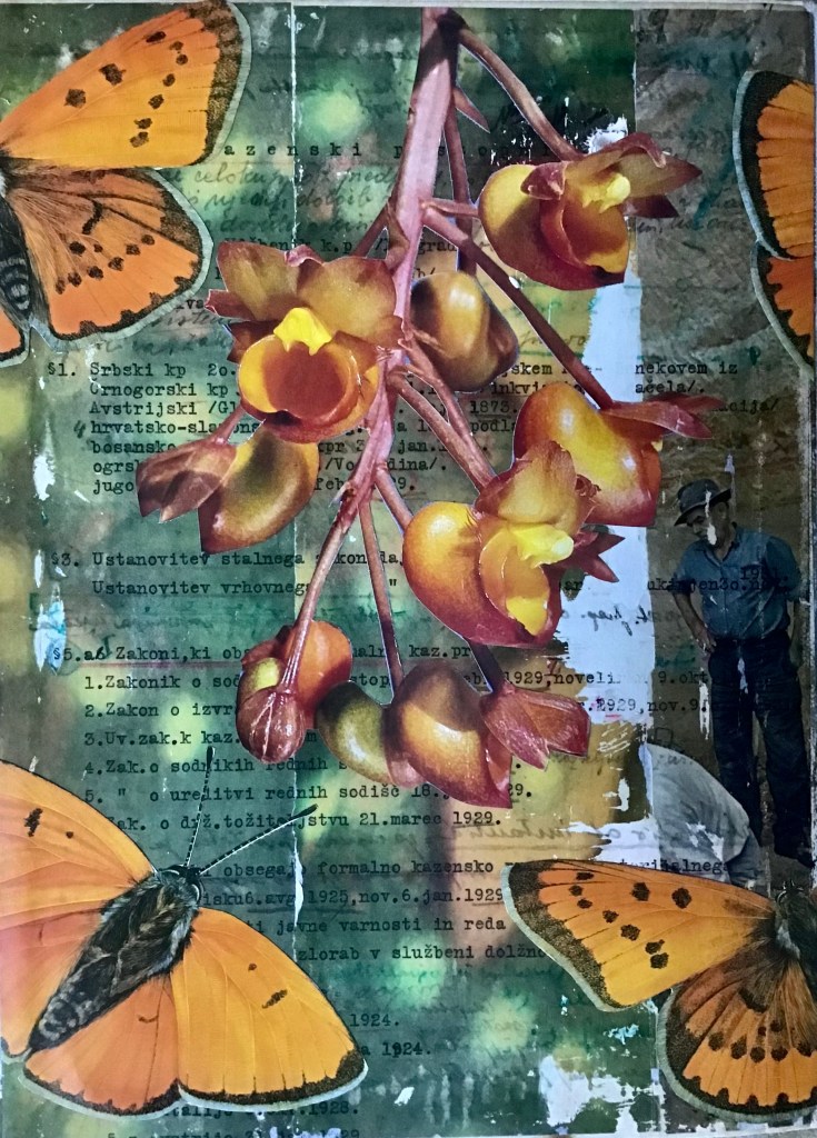 Pigmenttransfer and analog collage on vintage book cover and wood. 21x28cm.