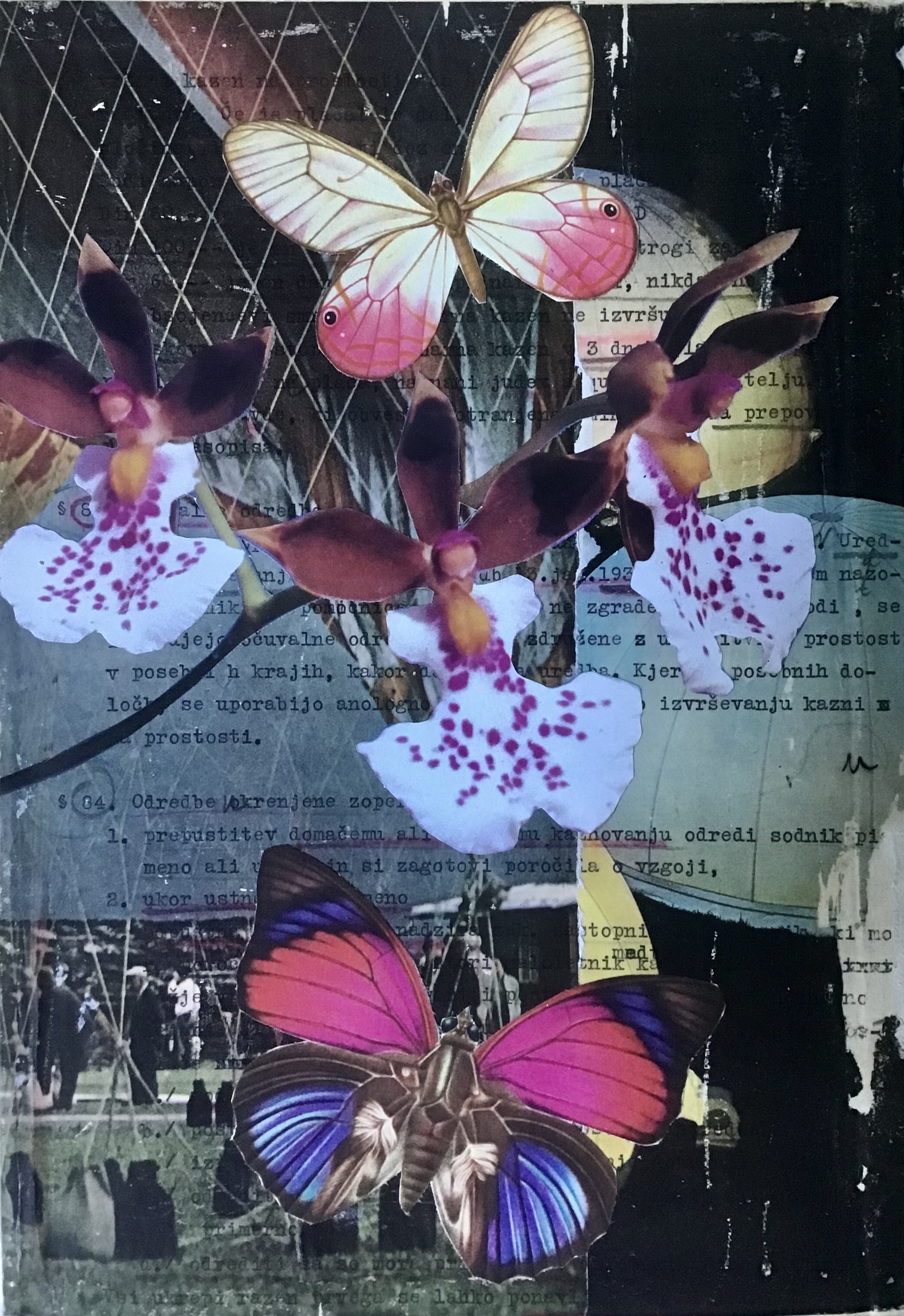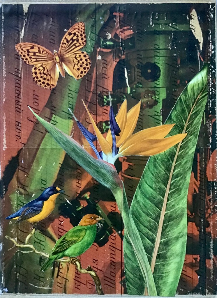 Pigmenttransfer and analog collage on vintage book cover. Mounted on wood. 21x28cm.