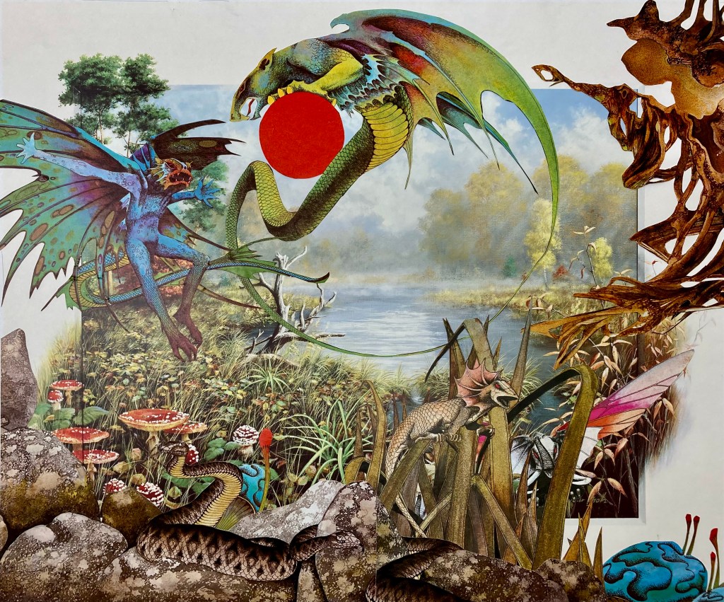 The images used in this collage are all from Roger Dean who made covers for various artists as Yes, Uriah Heep and Osibisa.