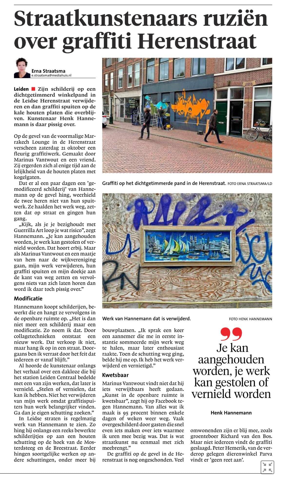 I fully understand that work in the open air is risky and can easily be damaged. Fine. But it is something else when “colleagues” get your work from the wall and change it for their work. It became a sort of argument where even local newspaper Leidsch Dagblad paid attention to.