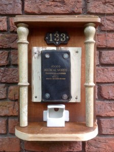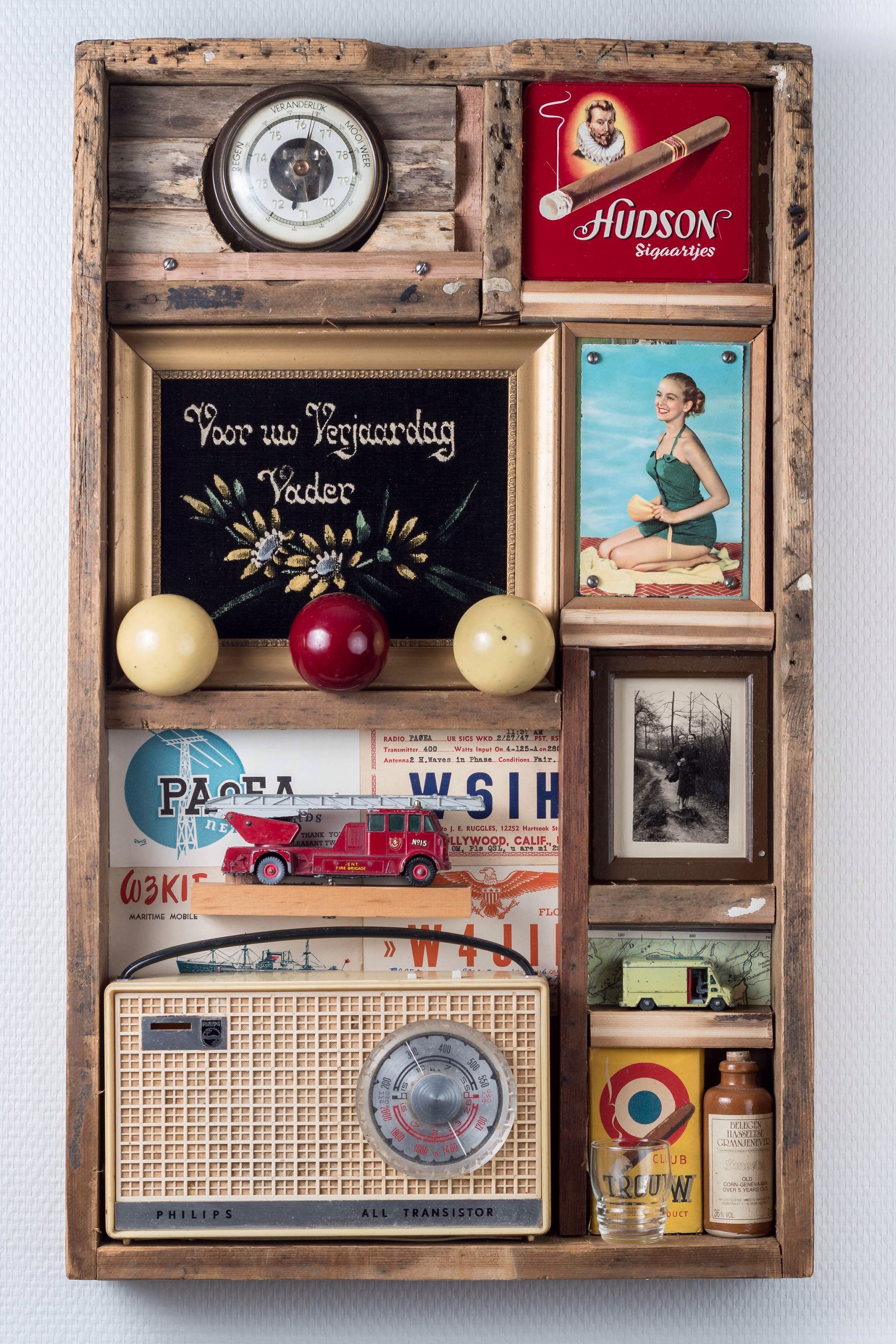 Big assemblage in old wooden frame. 70x40x10cm/28x16x4inch. With several old presents from the fifties and sixties: radio, cards from radio amateurs, small bottle of jenever, cigars, pin up etc.