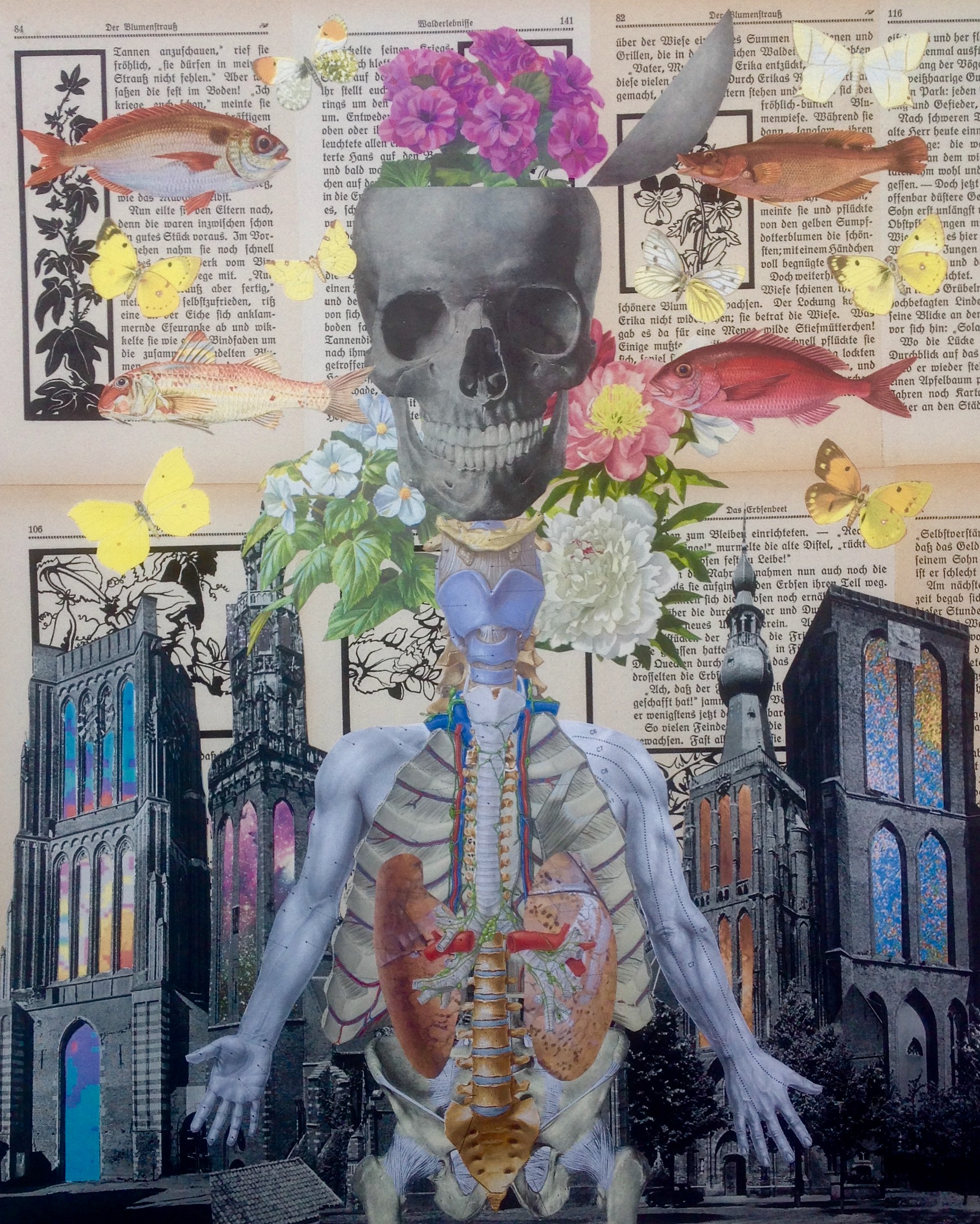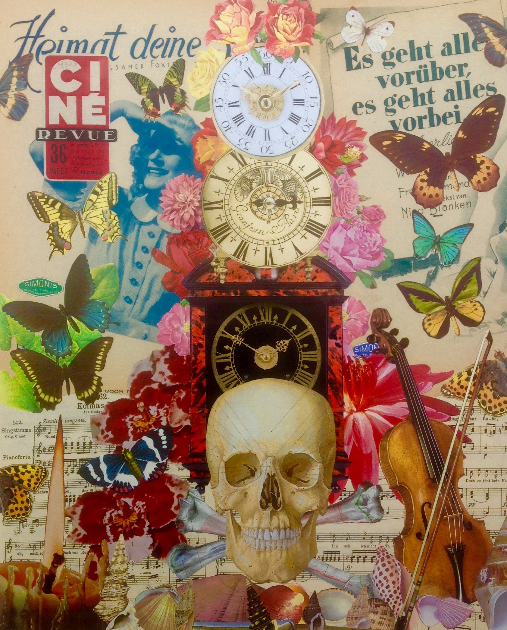 Assemblage on wooden archive shelf. 35x25x8cm/14x10x3inch. With a school-report from Petronella de Jager from Scheveningen from the twenties and other school related items.
