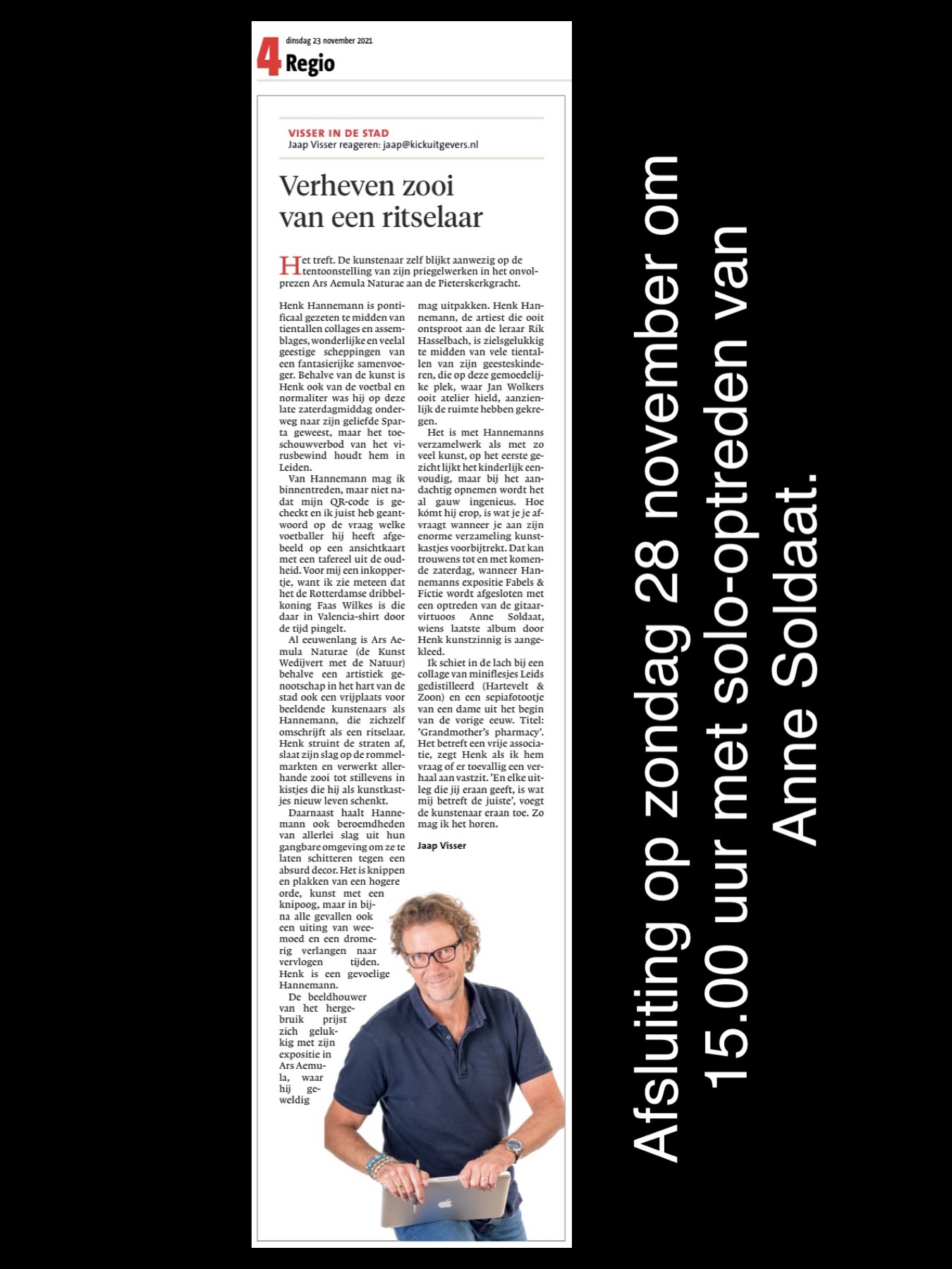 Column Jaap Visser in Leidsch Dagblad van dinsdag 23 november 2021. Afbeelding november 23, 2021 henkhannemann Een reactie plaatsen Expositie in ARS, Pieterskerkgracht 9a in Leiden. Tot en met 28 november 2021. Afsluiting met Anne Soldaat op 28 november om 15.00 uur.